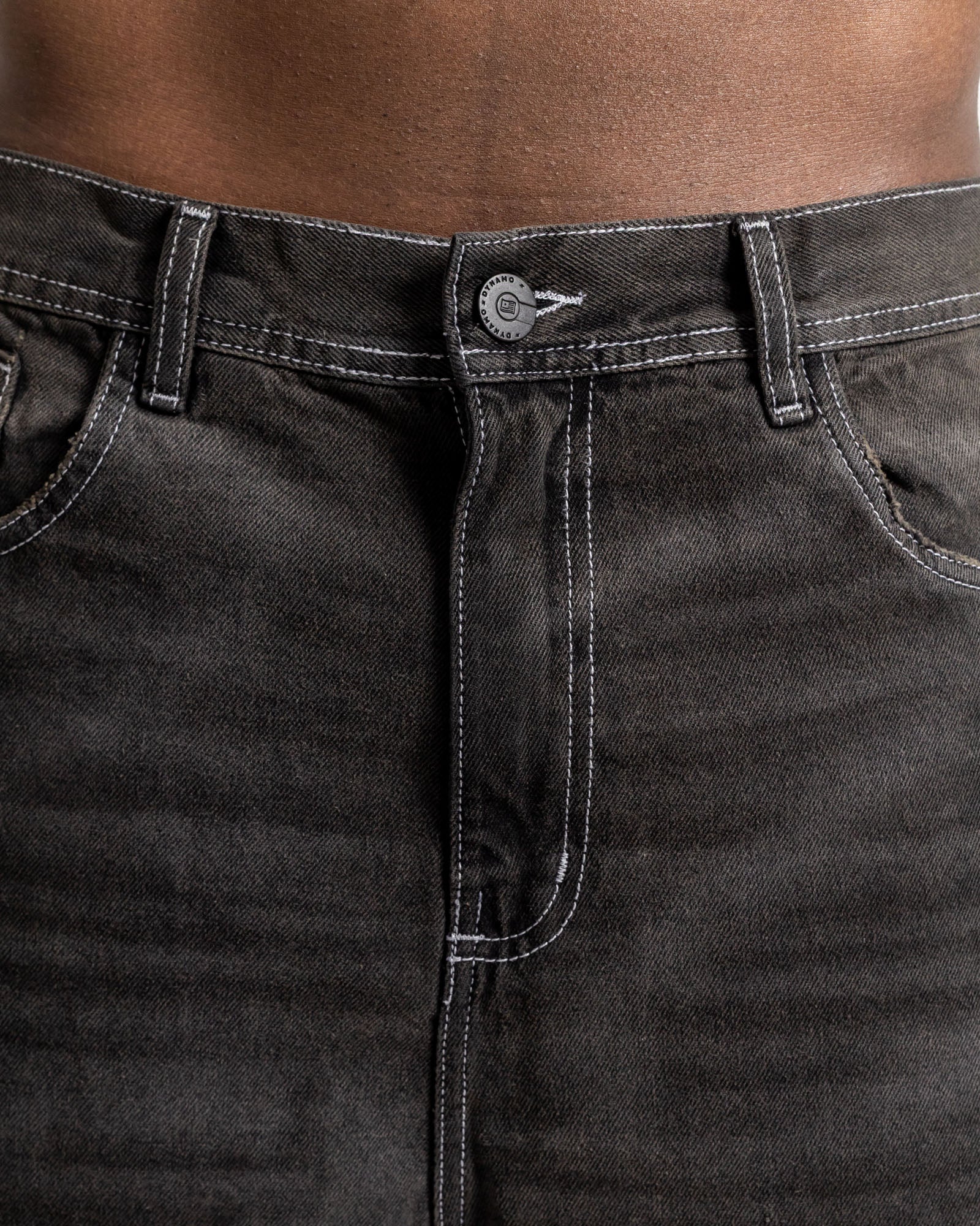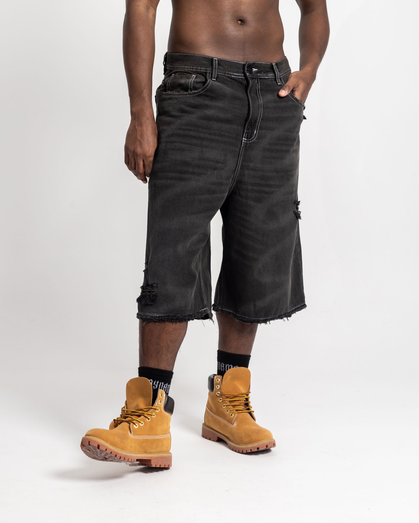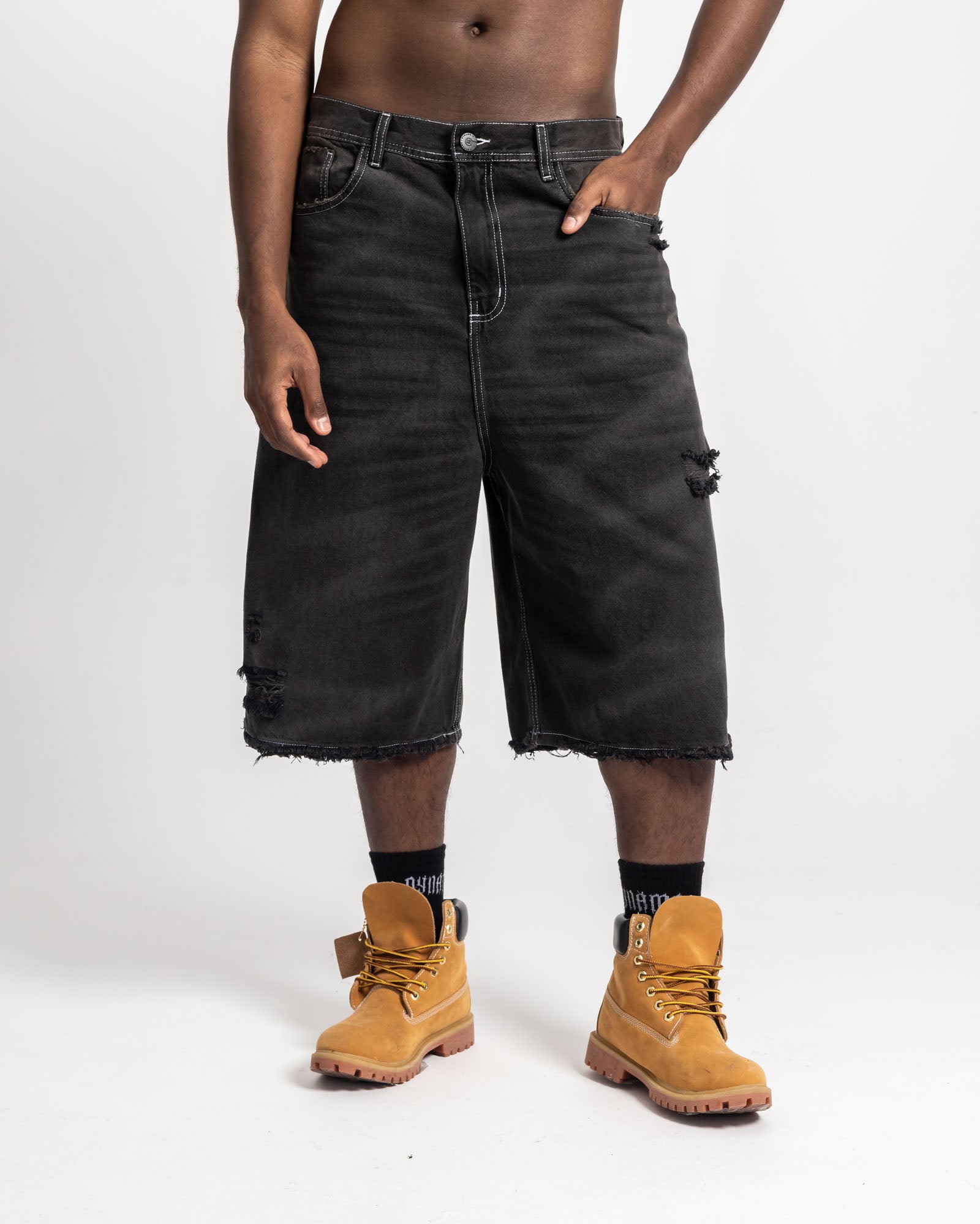 Bermuda jort de denim negro con lavado desgastado y rotos estratégicos que le dan carácter. Su corte amplio y estructura firme crean un fit dominante, pensado para la calle y para combinar con camisetas oversize y botas o sneakers pesados. Una prenda cruda, sin filtros, hecha para imponer presencia.