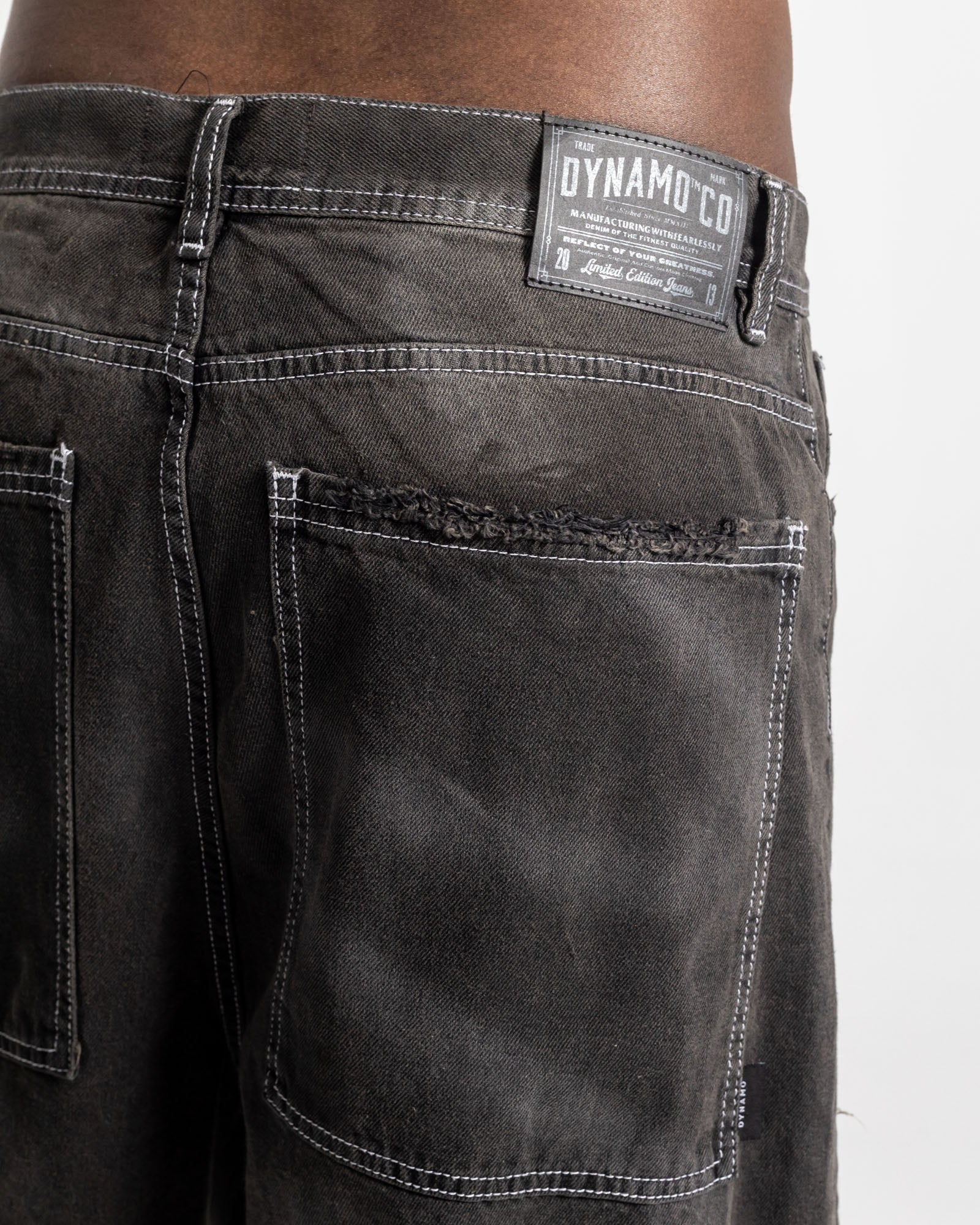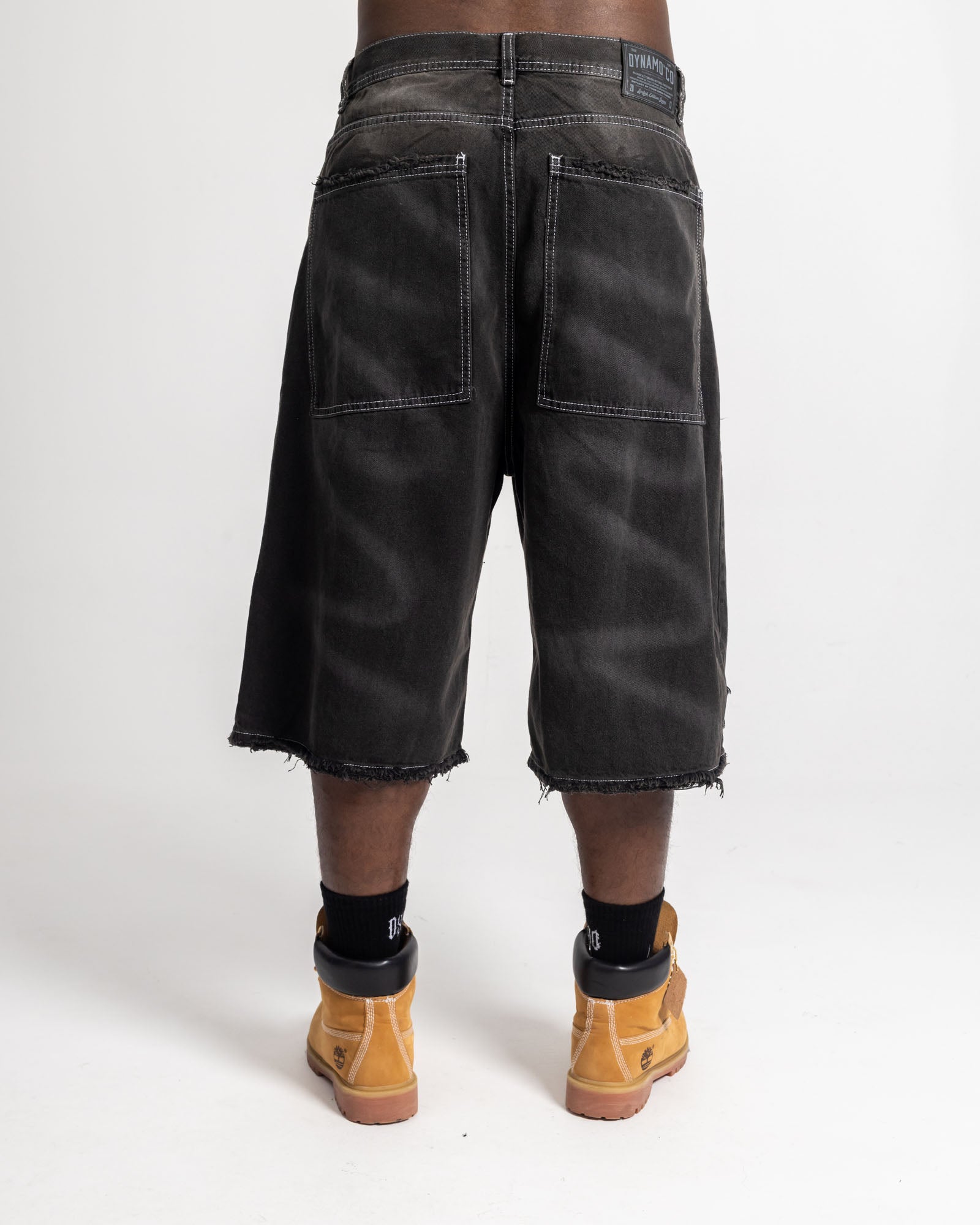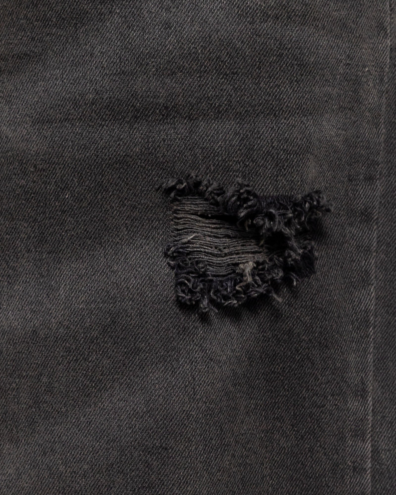 Bermuda jort de denim negro con lavado desgastado y rotos estratégicos que le dan carácter. Su corte amplio y estructura firme crean un fit dominante, pensado para la calle y para combinar con camisetas oversize y botas o sneakers pesados. Una prenda cruda, sin filtros, hecha para imponer presencia.