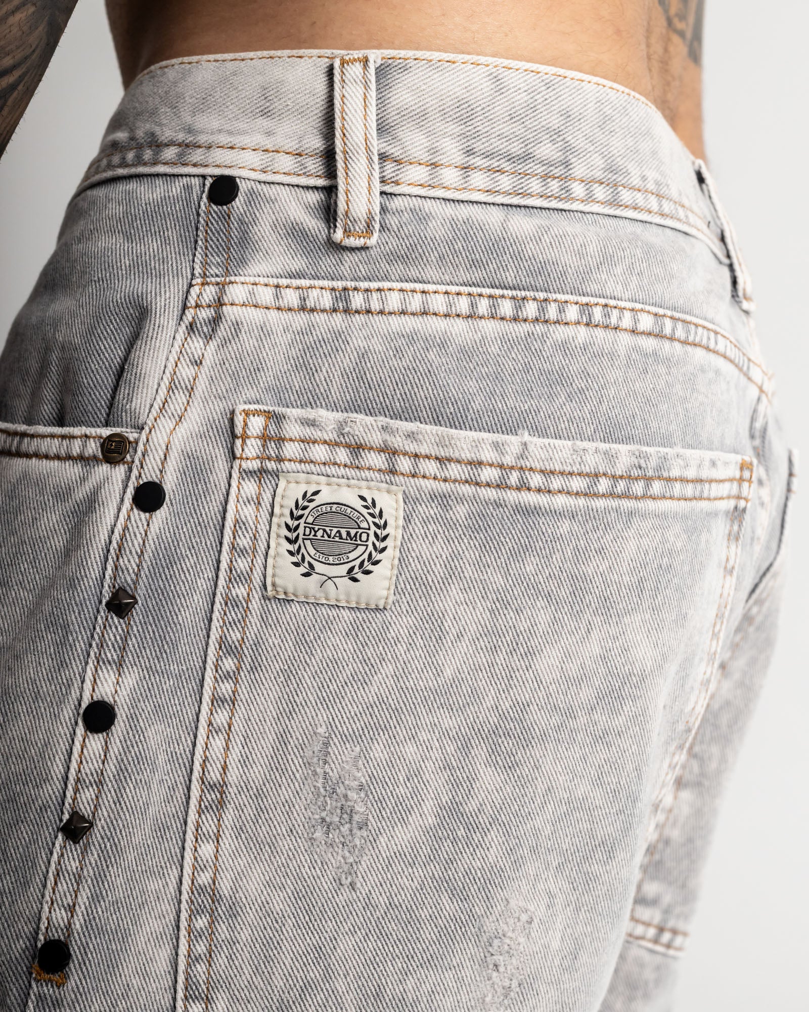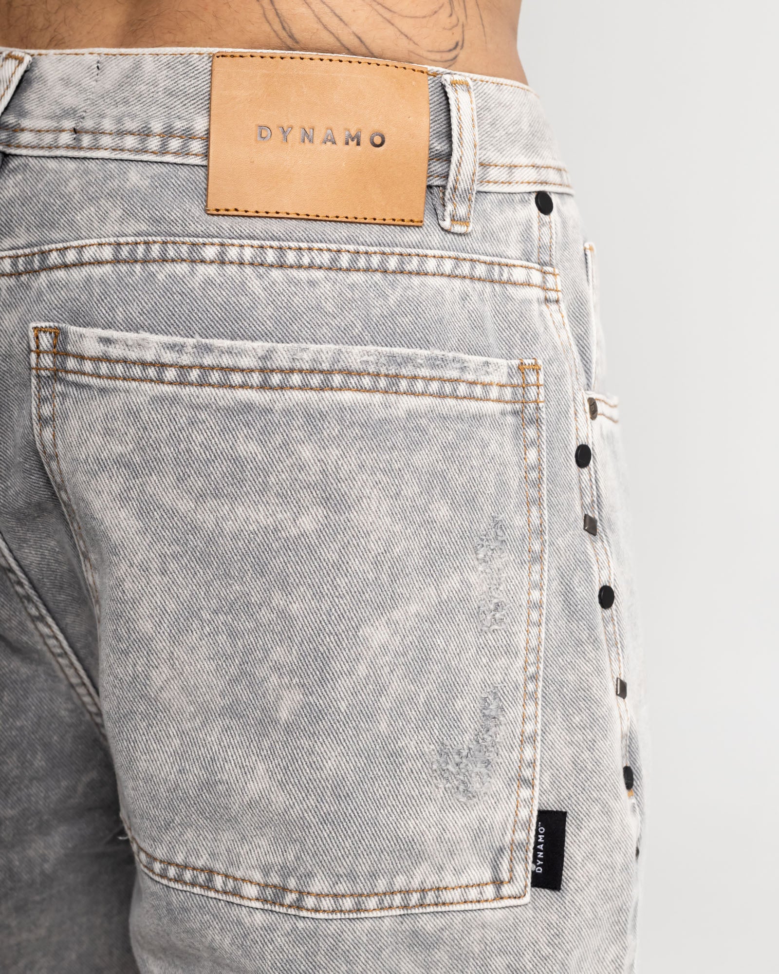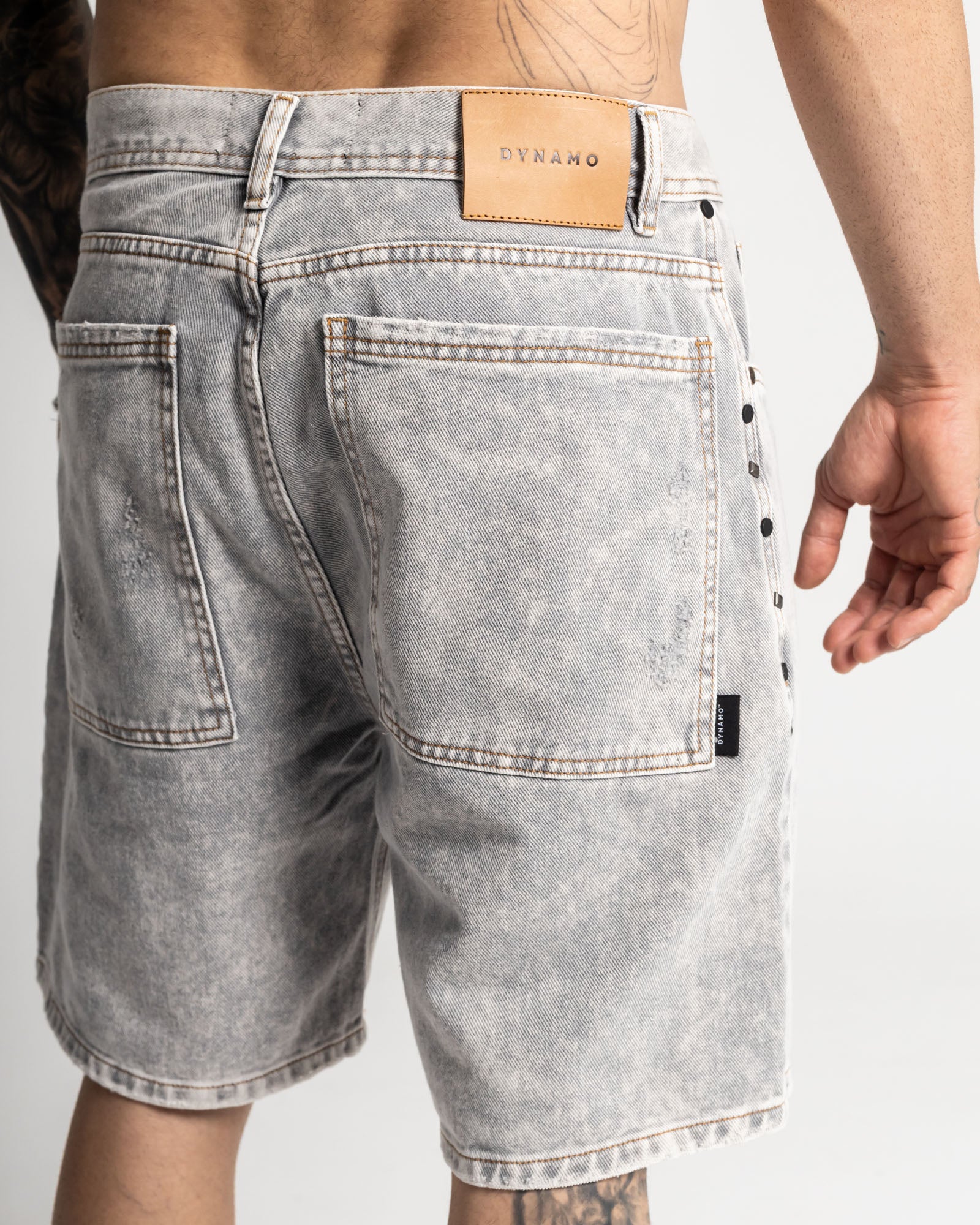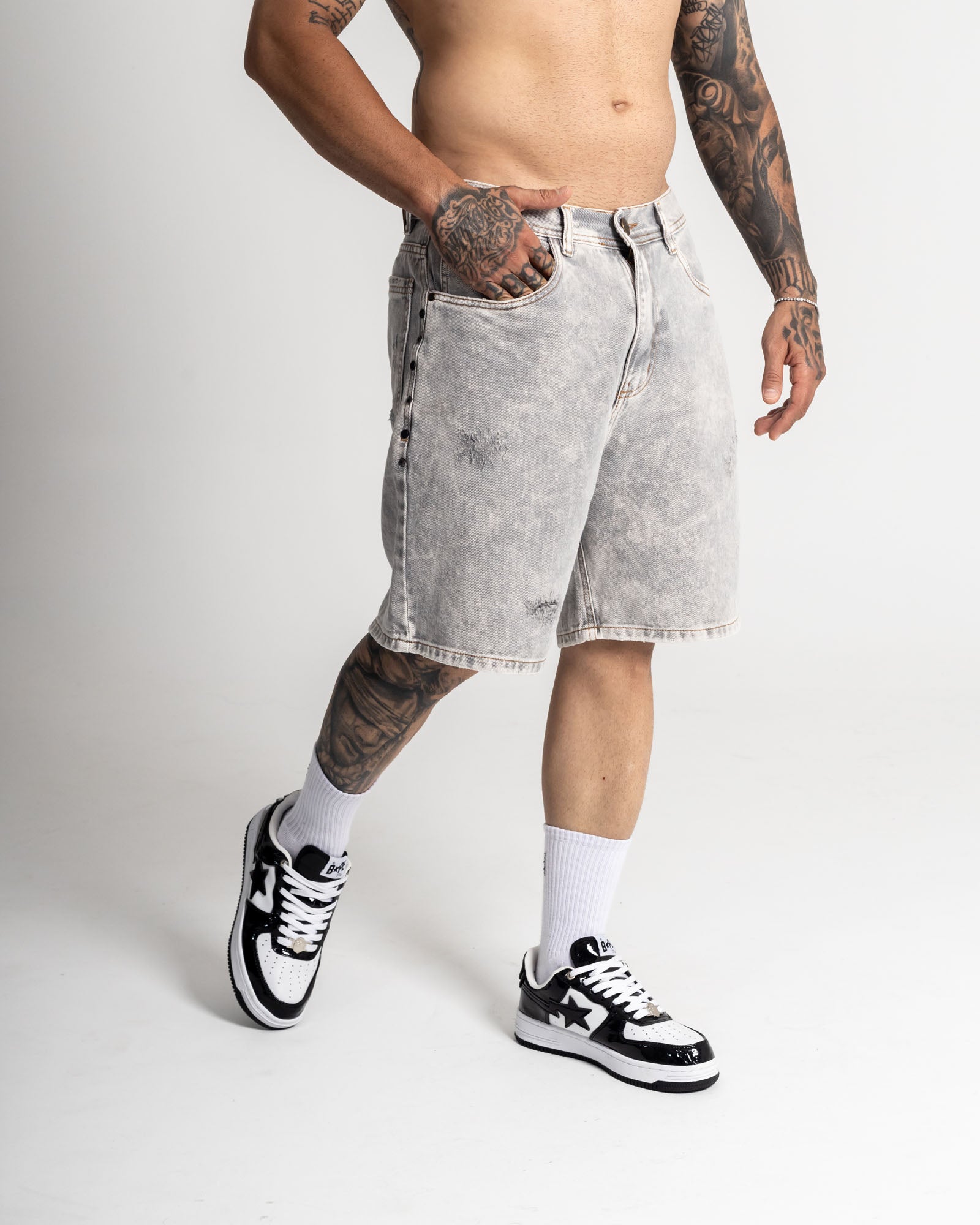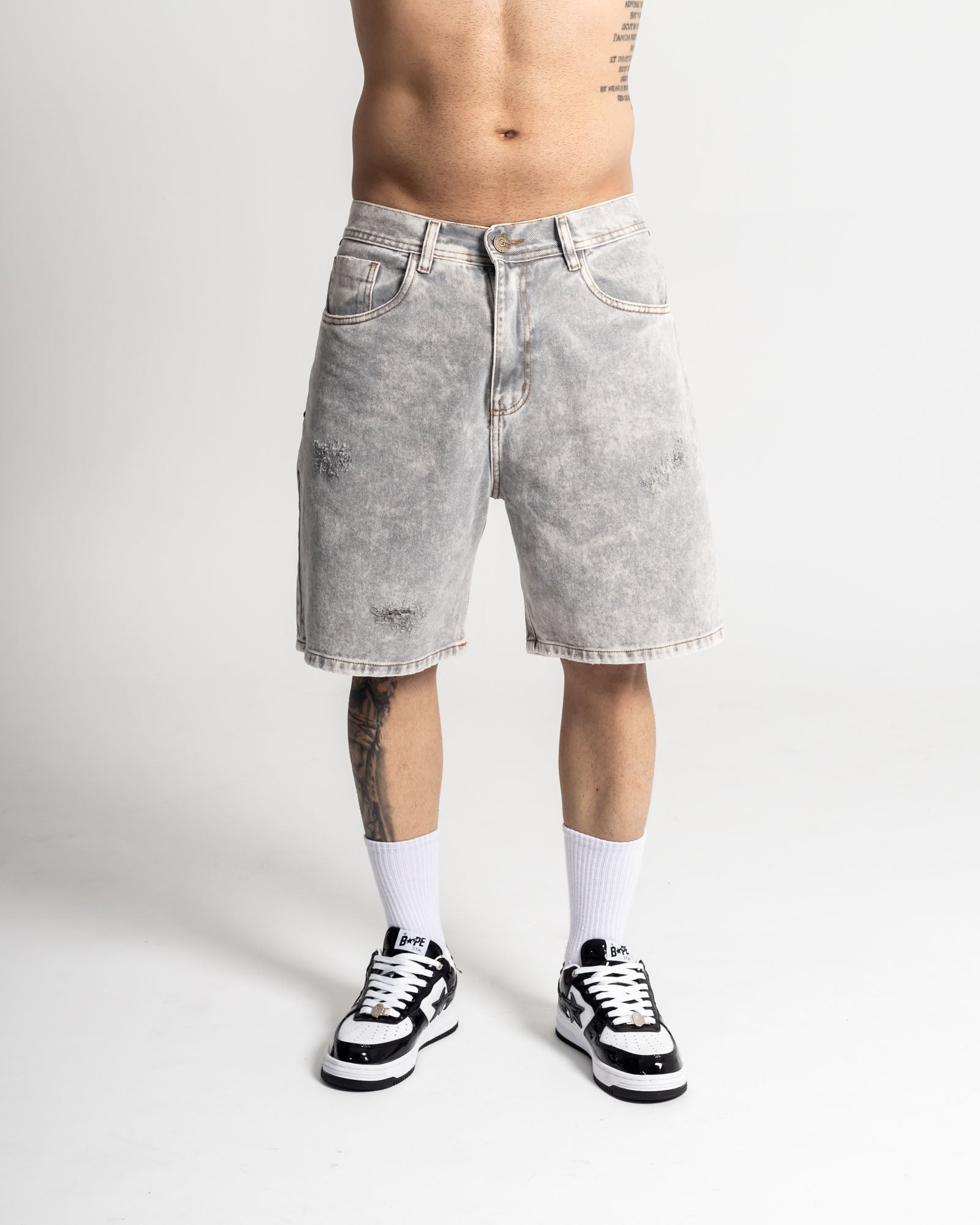 Bermuda regular en denim rígido con lavado gris ácido de alto contraste, perfecta para un look urbano y fresco. Construcción resistente, textura marcada y desgastes frontales que le dan carácter. Incluye bolsillos funcionales, pretina clásica y remaches laterales metálicos que elevan el detalle. Fit cómodo sin perder la estructura del denim.