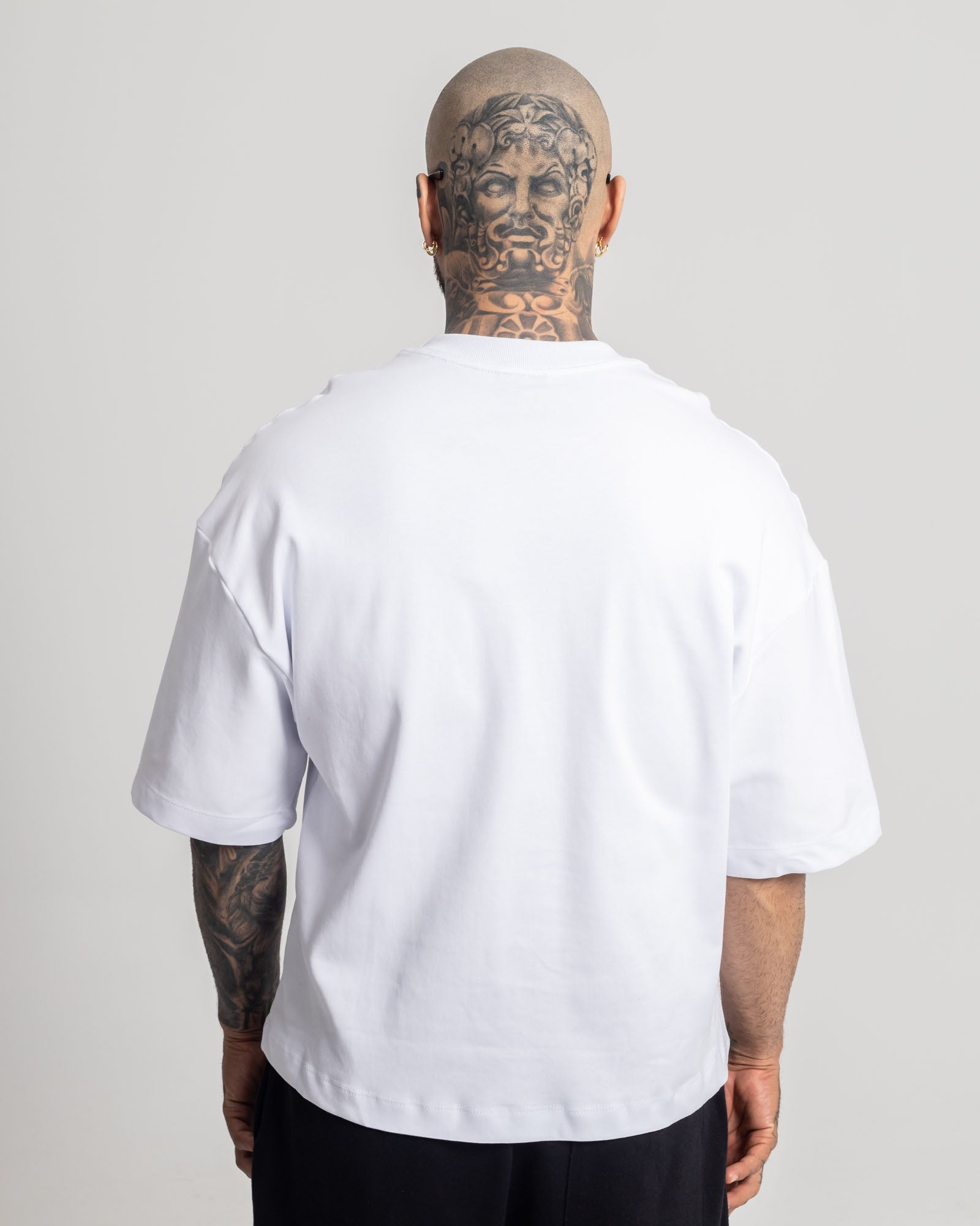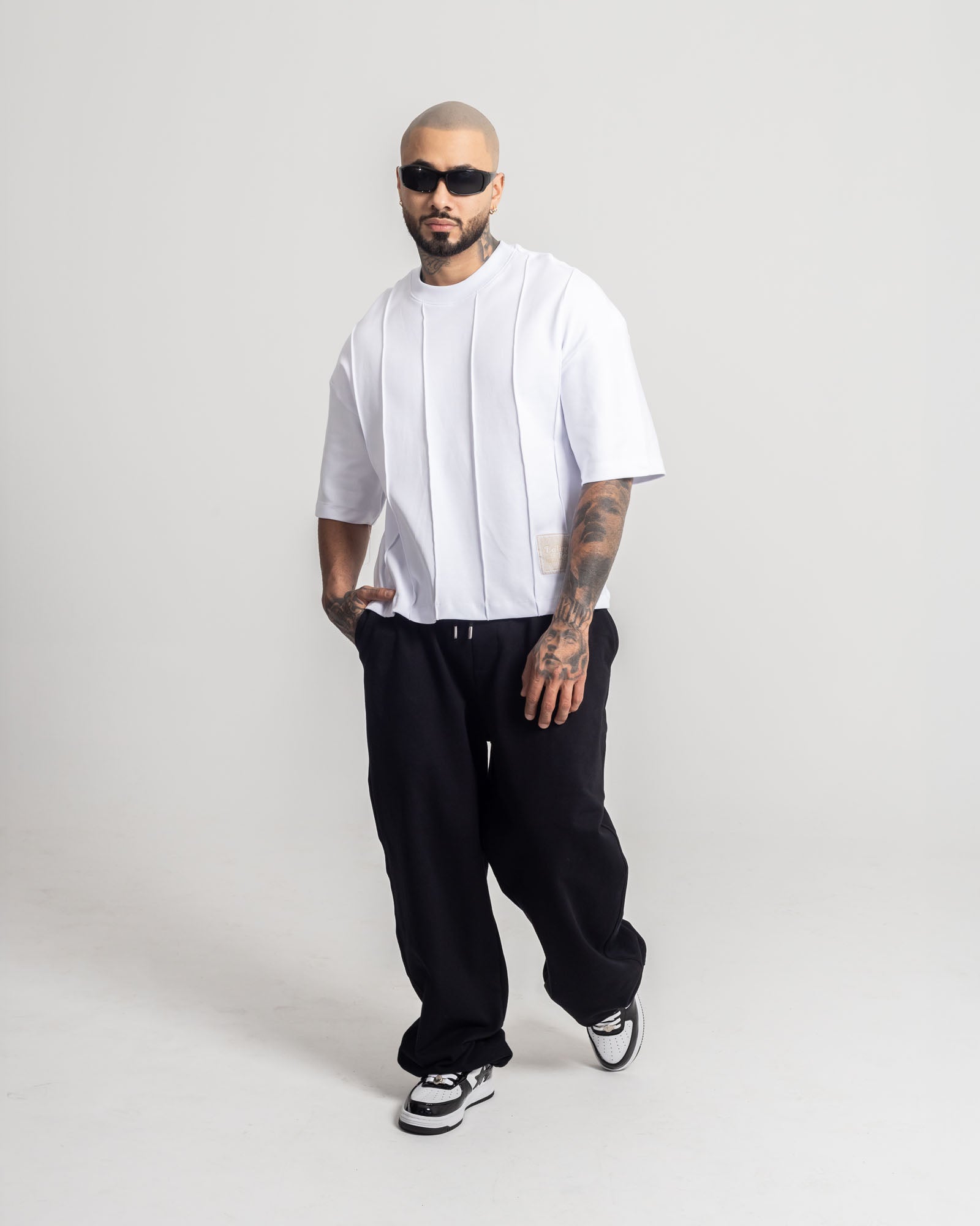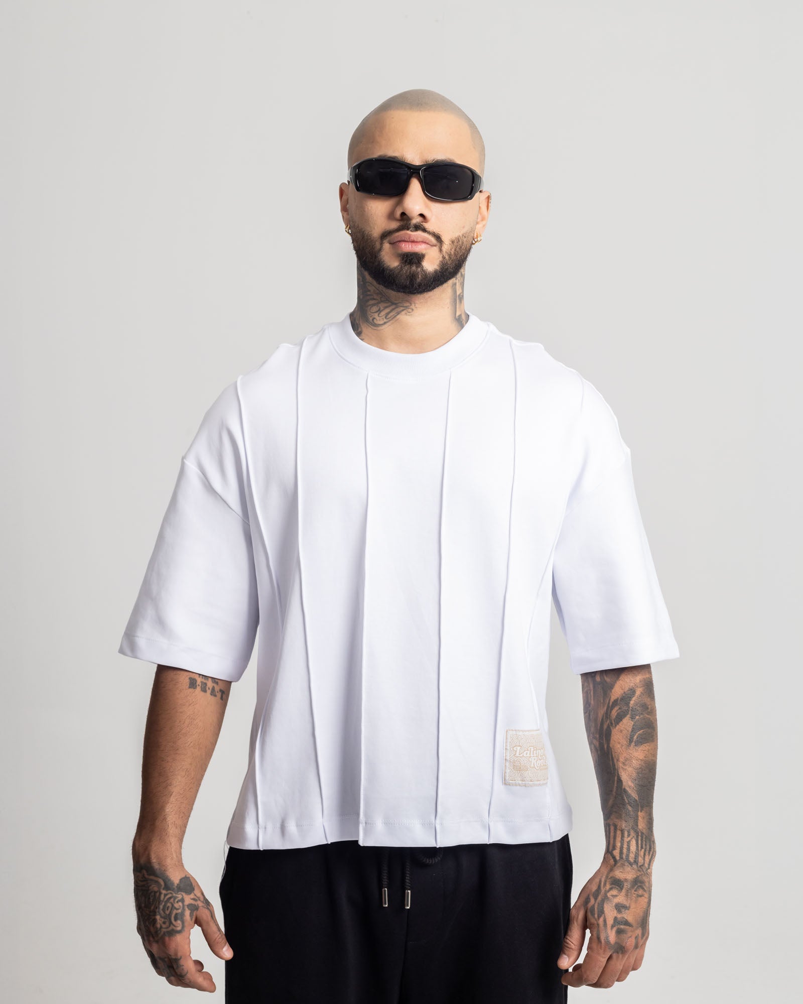 Camiseta Boxy en algodón premium con estructura marcada en costuras verticales que le dan un look táctico y limpio. Fit amplio, caída rígida y parche decorativo en bajo que firma el ADN Dynamo.