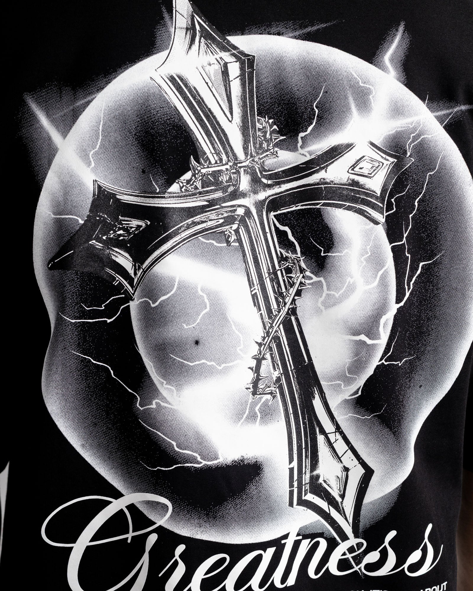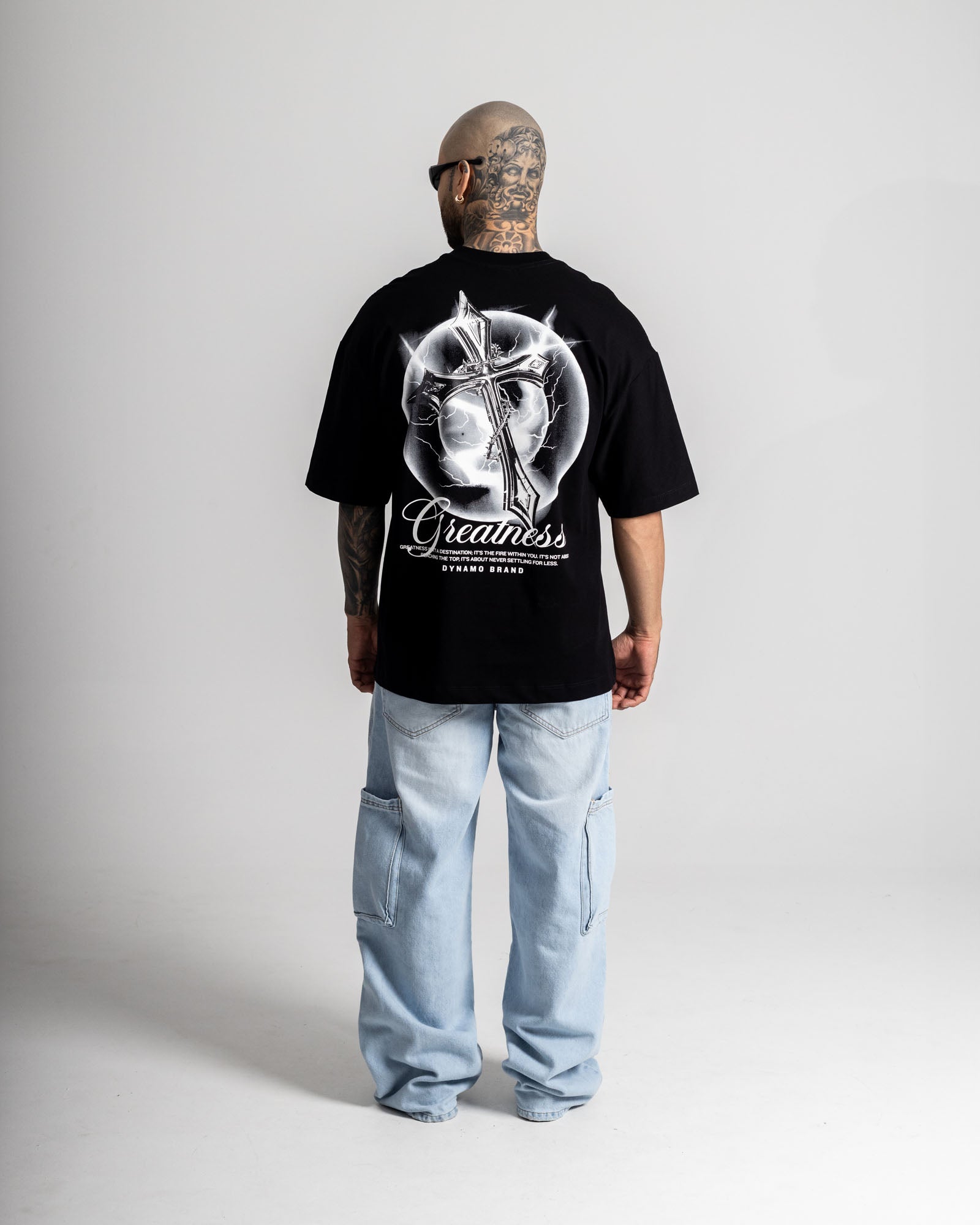 Camiseta oversize en algodón de alta calidad, diseñada para destacar con actitud y significado. Silueta amplia, cuello reforzado y caída pesada para un fit street auténtico. Gráfico posterior de alto impacto con simbología sagrada y detalles tipográficos premium que elevan el diseño.