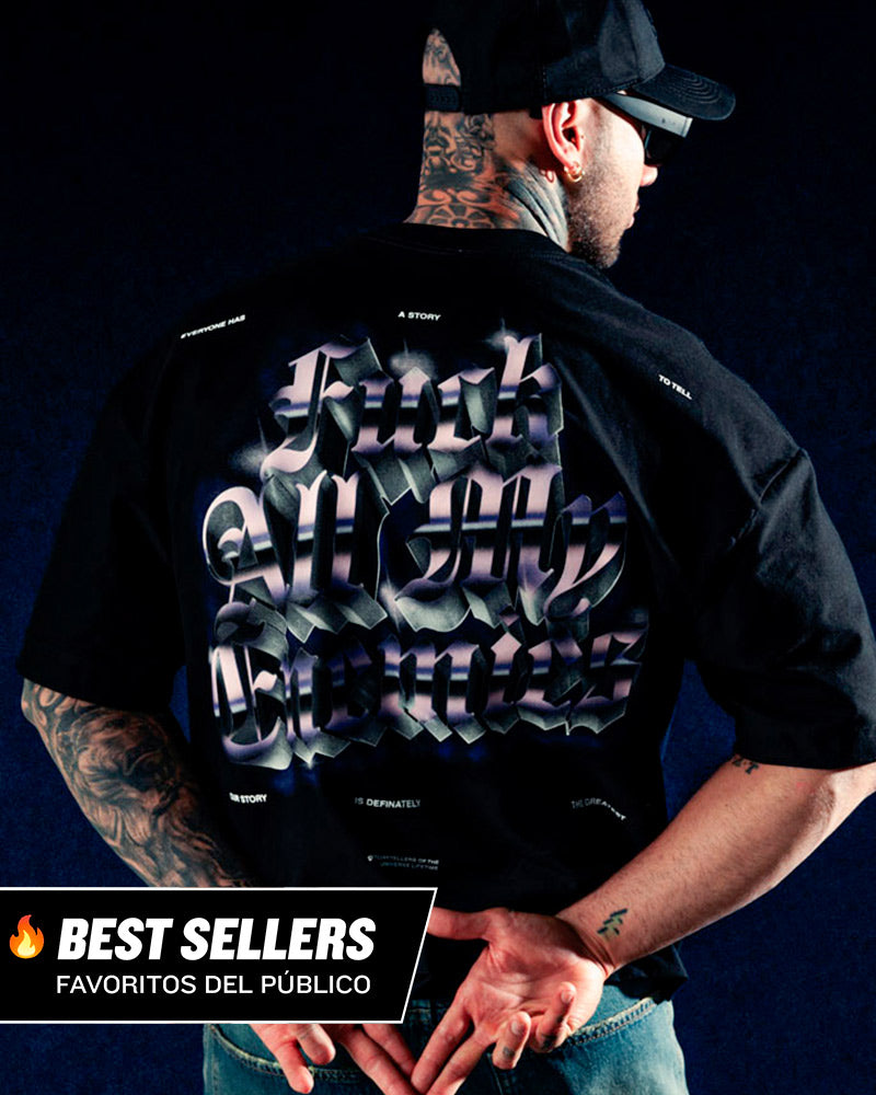 Camiseta Boxy Fit en algodón peruano premium (190-220 g), con estampado tipográfico gótico en degradé púrpura Fuck All My Enemies. Corte amplio y estructura firme, pensada para un statement urbano sin filtros, directo desde la calle.