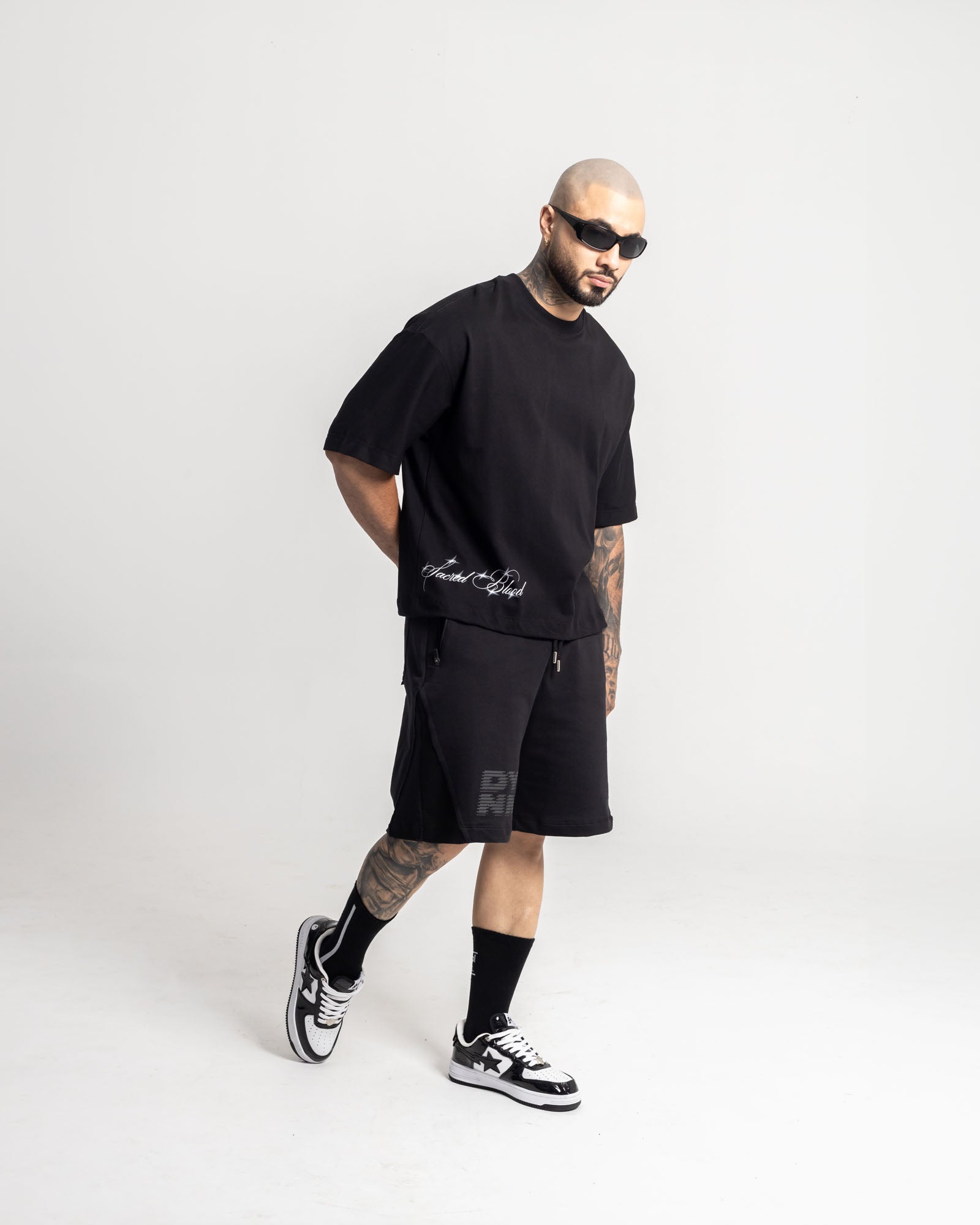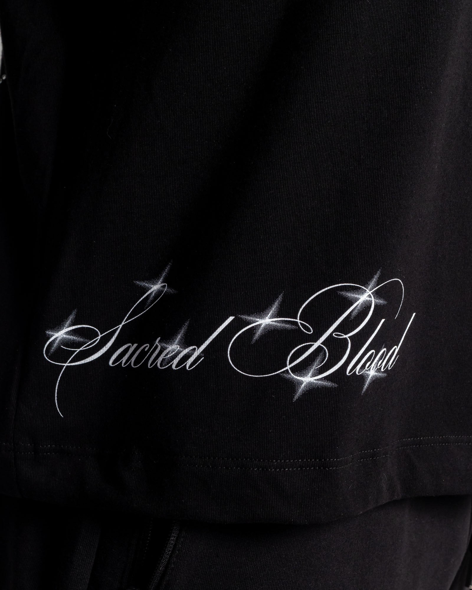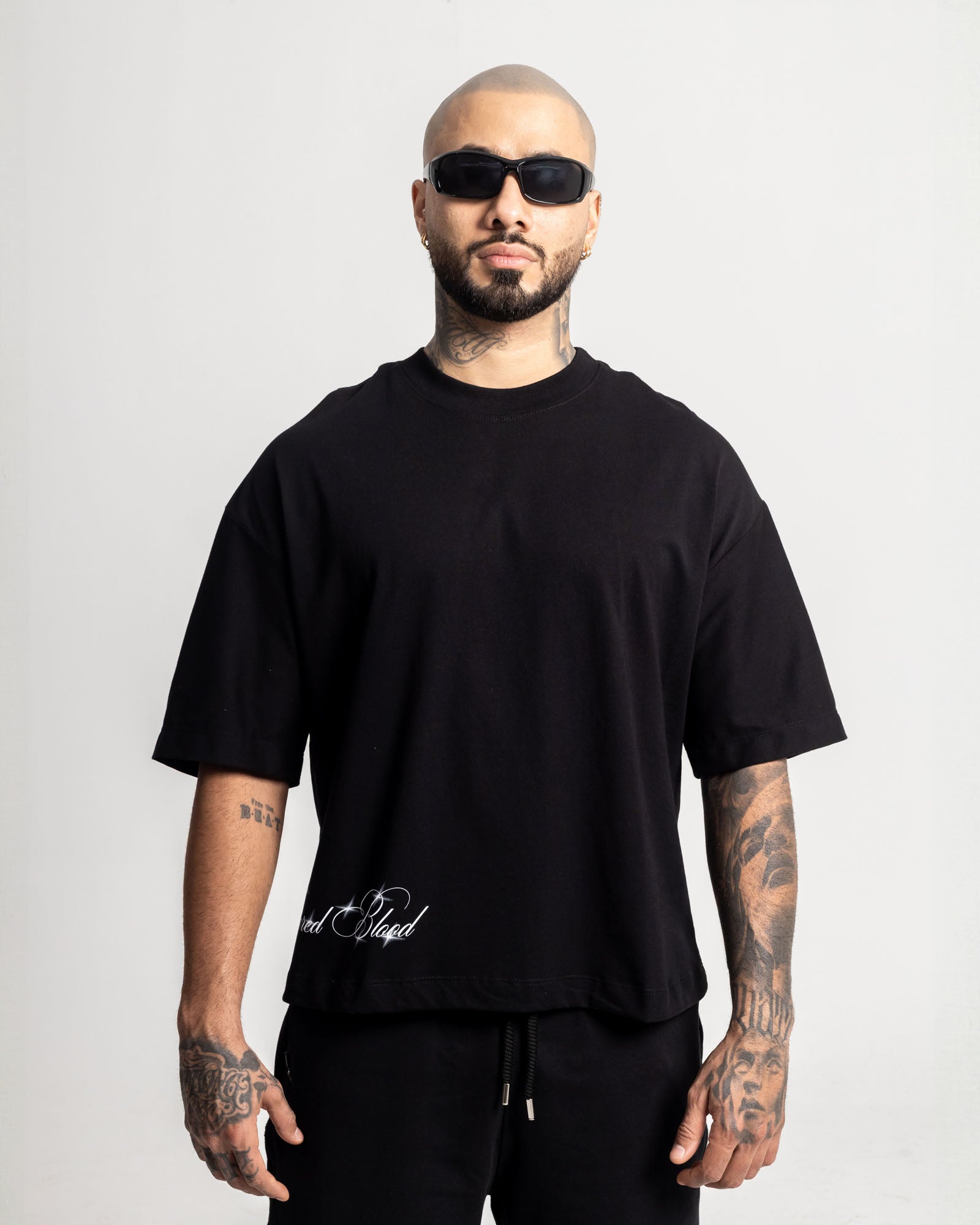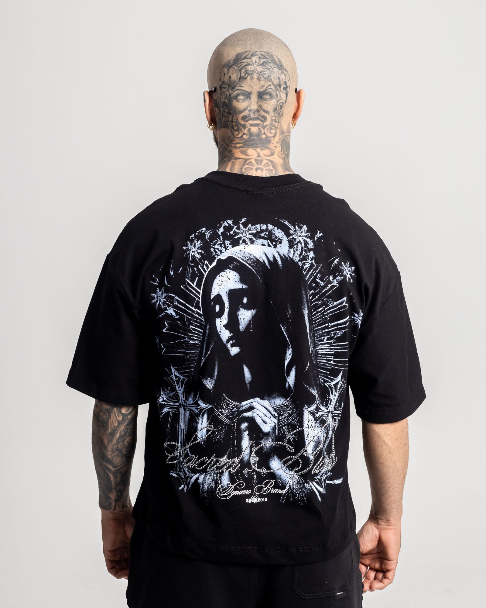 Camiseta Boxy Fit en algodón premium con ilustración tipo dark-art en la espalda, realzada con brillos en rhinestones que elevan la pieza a nivel de statement. Frente limpio, caída amplia y fit poderoso.