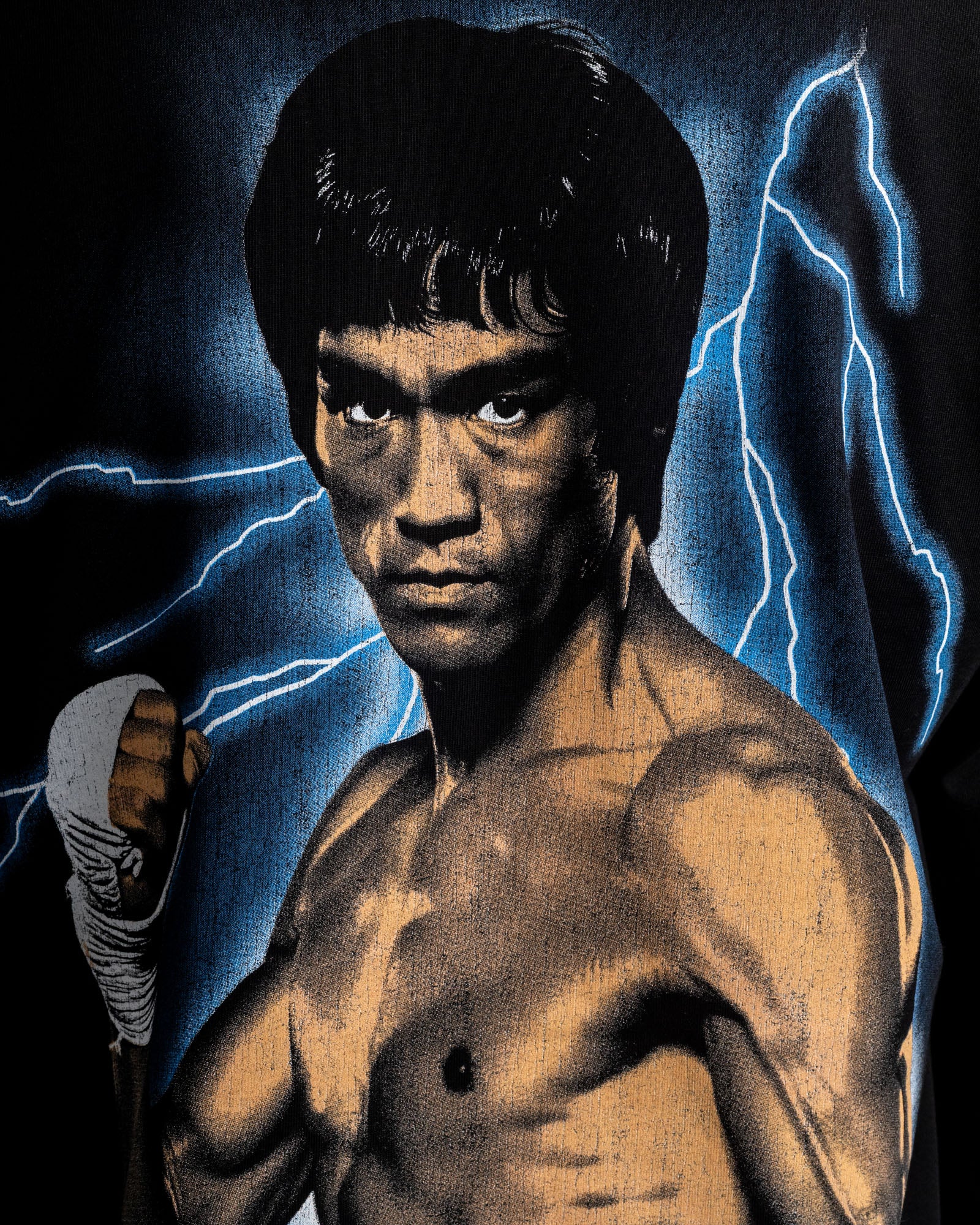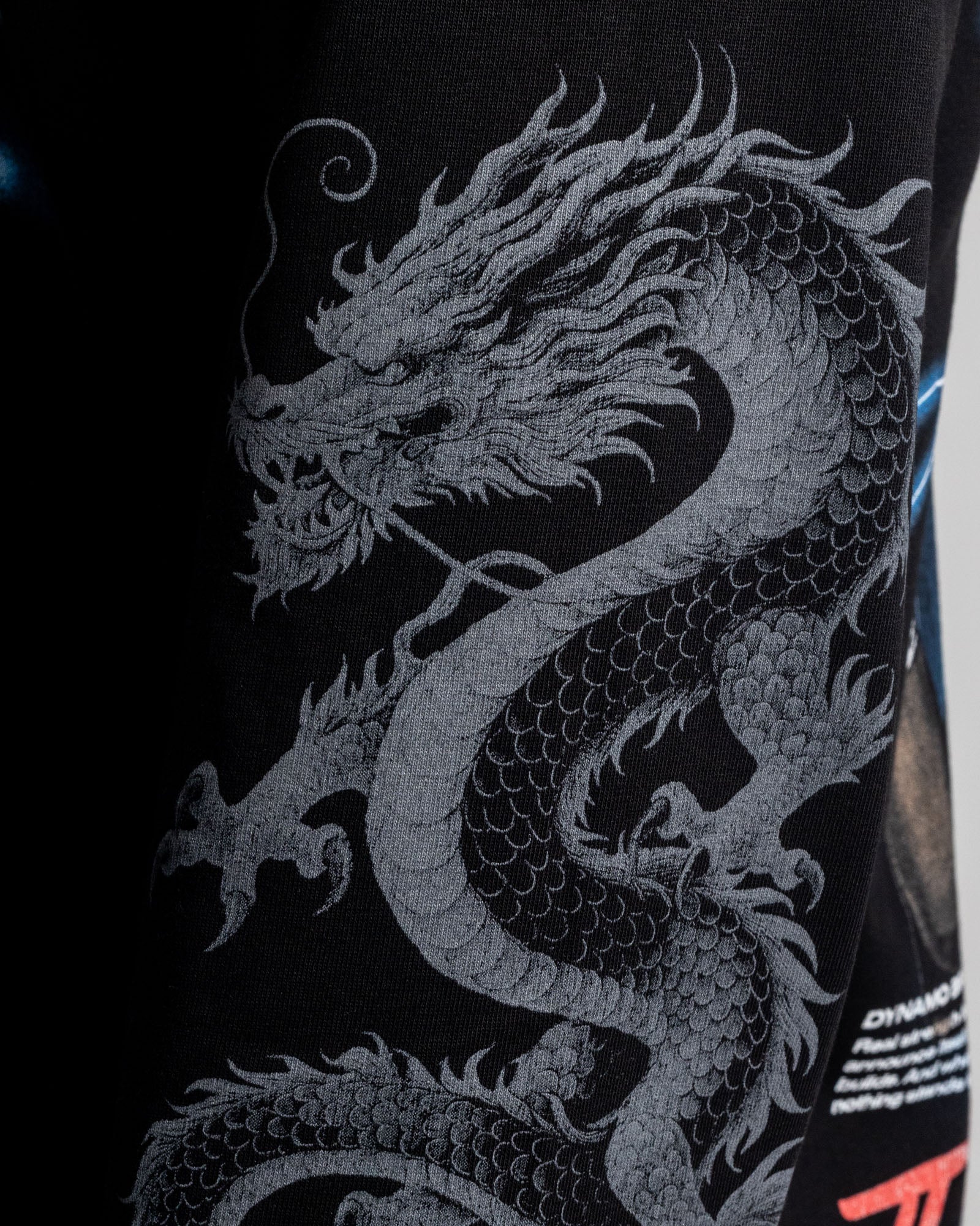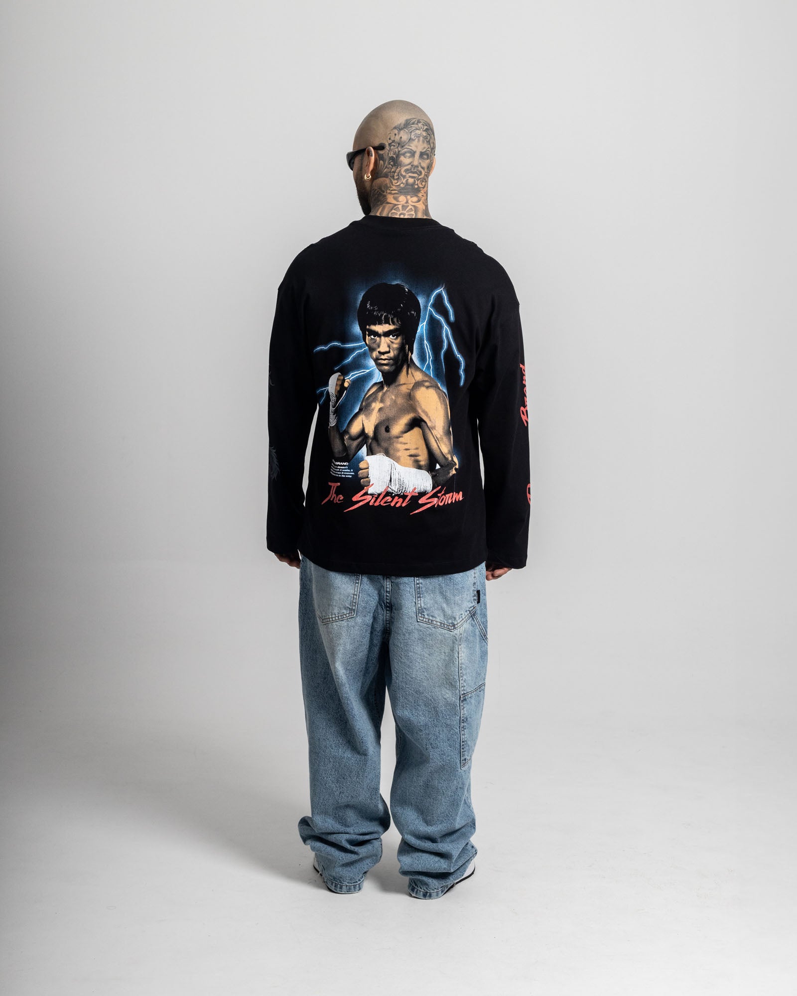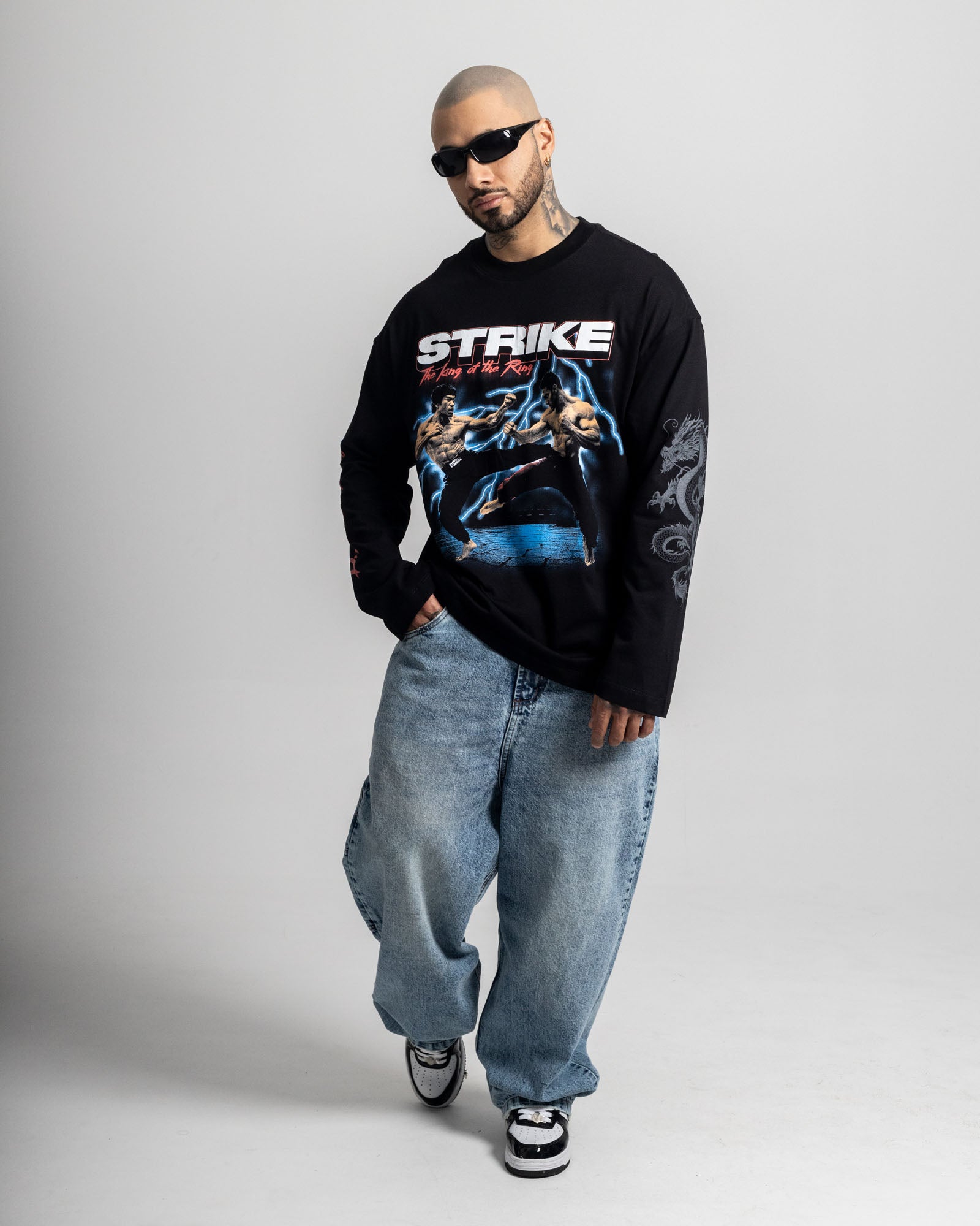 Camiseta manga larga de silueta amplia y caída estructurada, confeccionada en algodón de alto gramaje. Diseño gráfico frontal y trasero de alto impacto con ilustración icónica, efectos de luz y rayos en contraste, más estampado complementario en mangas. Cuello reforzado y acabados premium que elevan el look.
