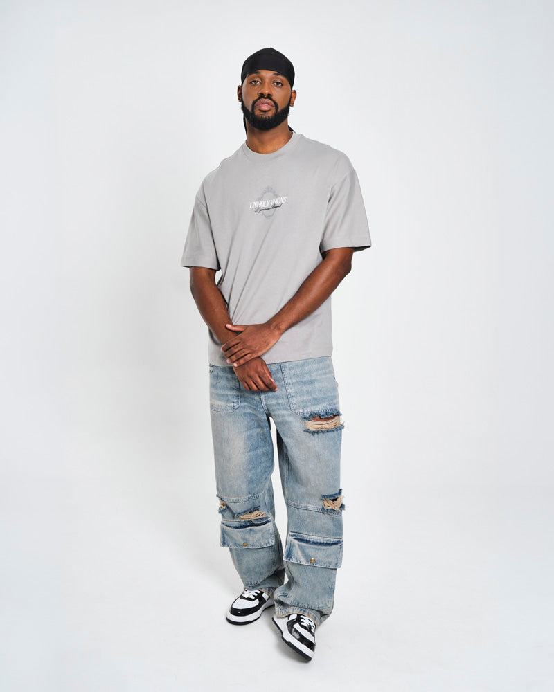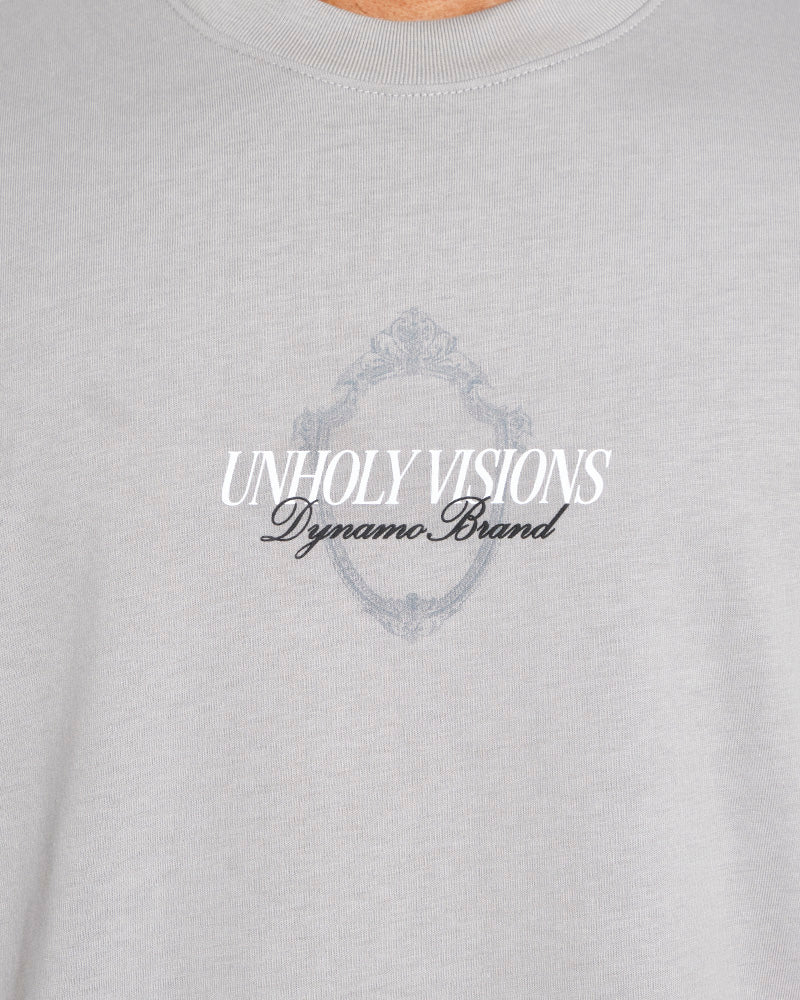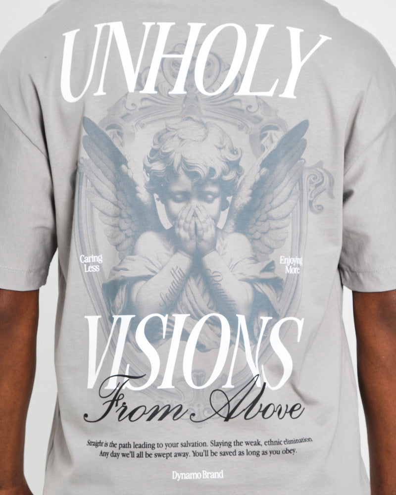 Camiseta oversize gris en algodón de alto gramaje, con fit amplio y caída estructurada que aporta presencia urbana. Diseño frontal minimal con logo “Unholy Visions” y estampado trasero de gran formato con arte angelical reinterpretado en estética street. Tipografía en alto contraste y acabado premium sobre base textil resistente. Cuello redondo reforzado y confección de alta durabilidad.