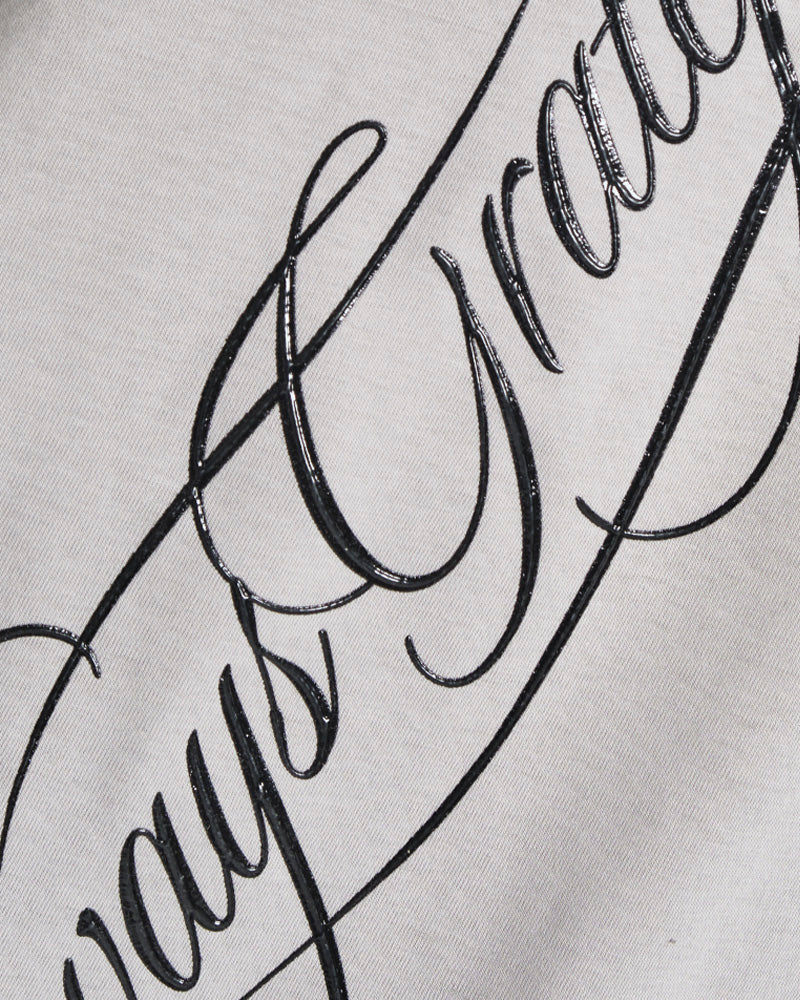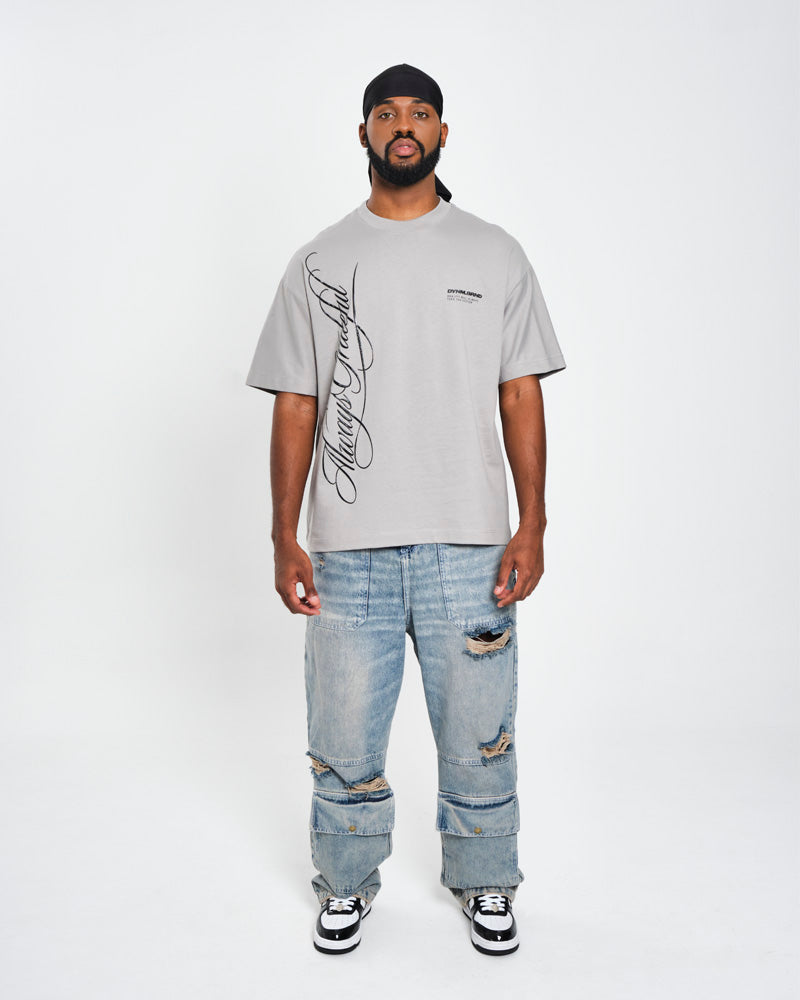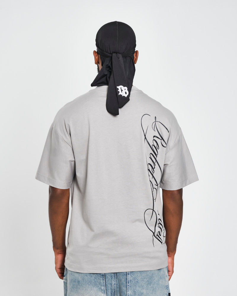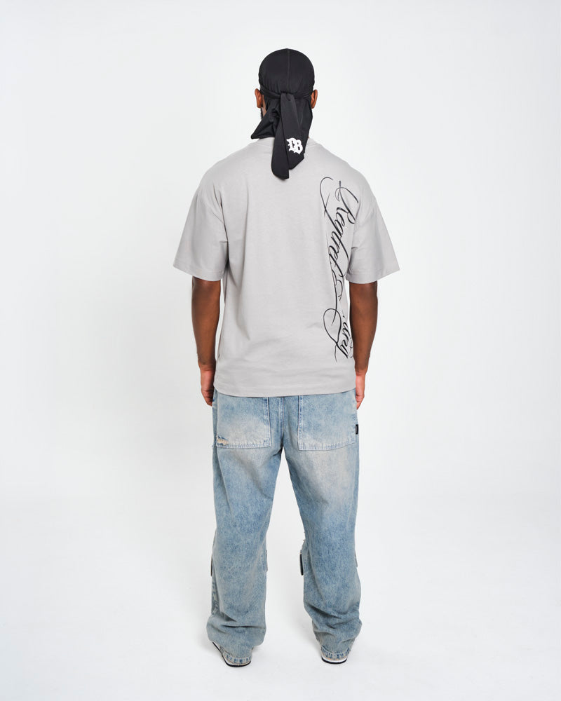 Camiseta oversize gris en algodón de alto gramaje, con silueta amplia y caída estructurada que aporta volumen y actitud urbana. Diseño tipográfico vertical en contraste negro con acabado estilizado que recorre el frente y la espalda, acompañado de logo minimal en pecho. Cuello redondo reforzado, hombros amplios y confección resistente que garantiza durabilidad y comodidad.