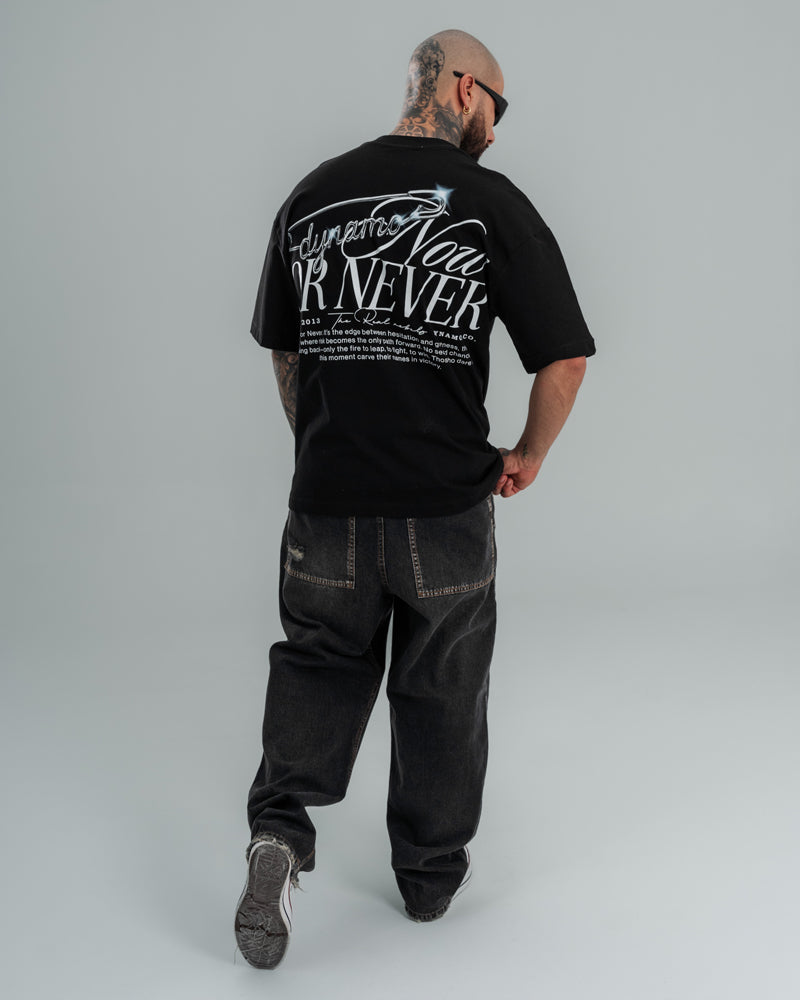 Camiseta Oversize Now or Never representa el espíritu imparable de Dynamo. Hecha en 100% algodón peruano (190–220 g), combina estructura sólida con una caída relajada y un estampado tipográfico poderoso que grita actitud y propósito.