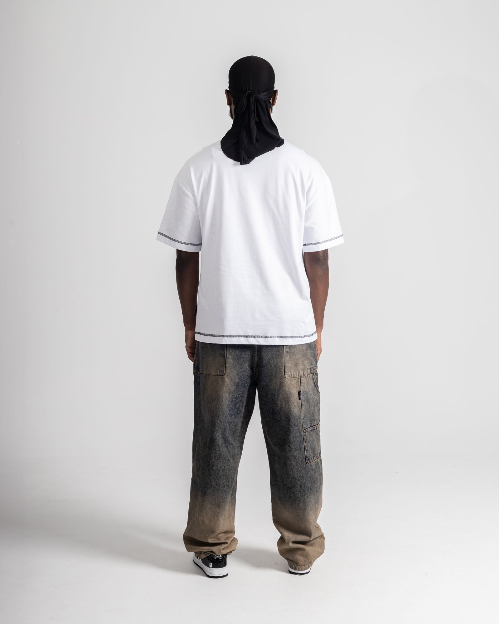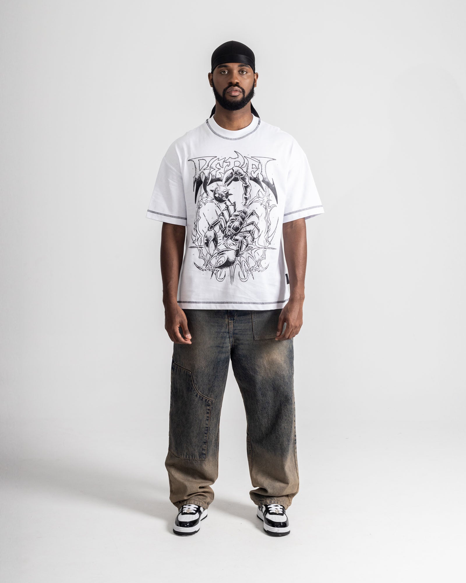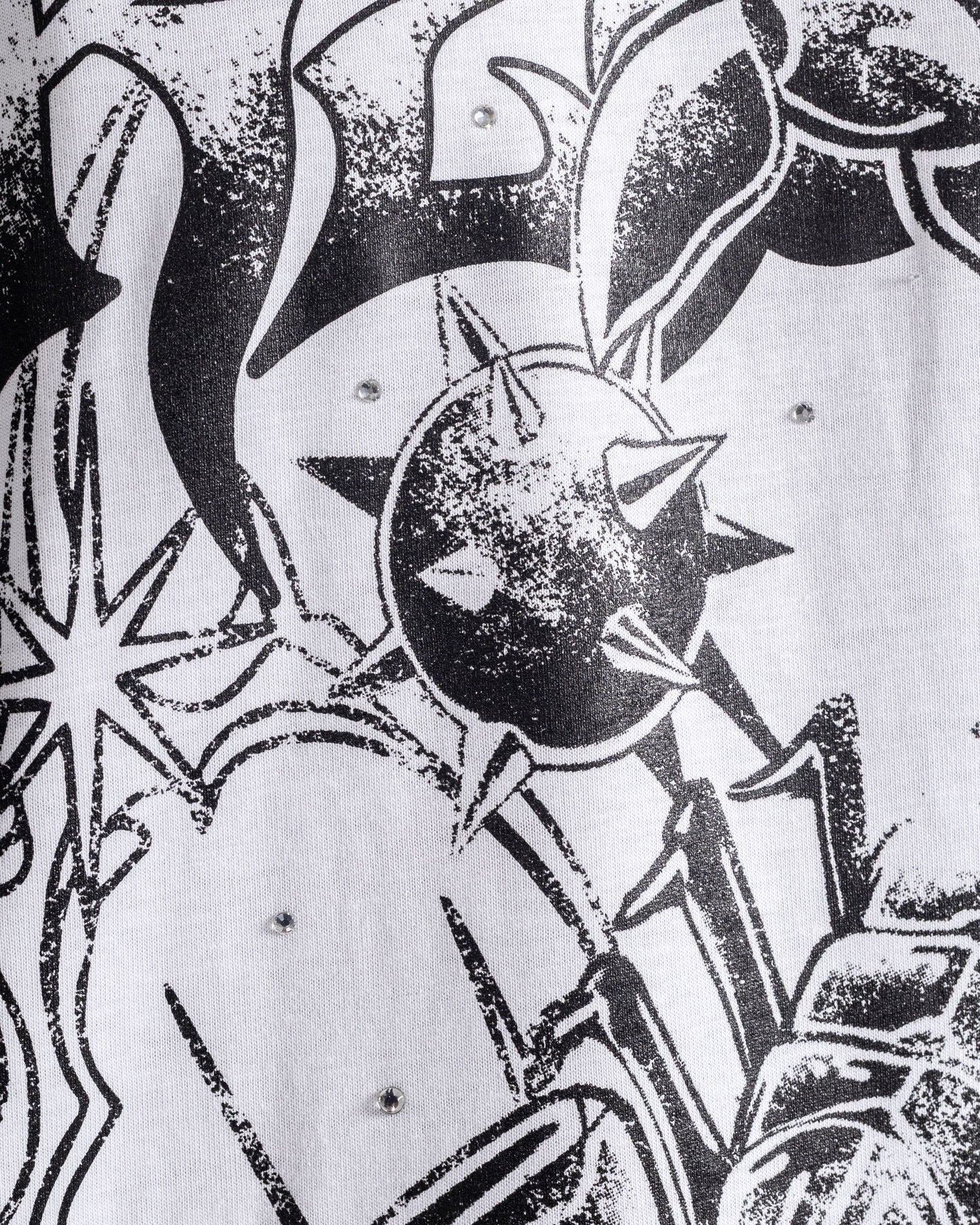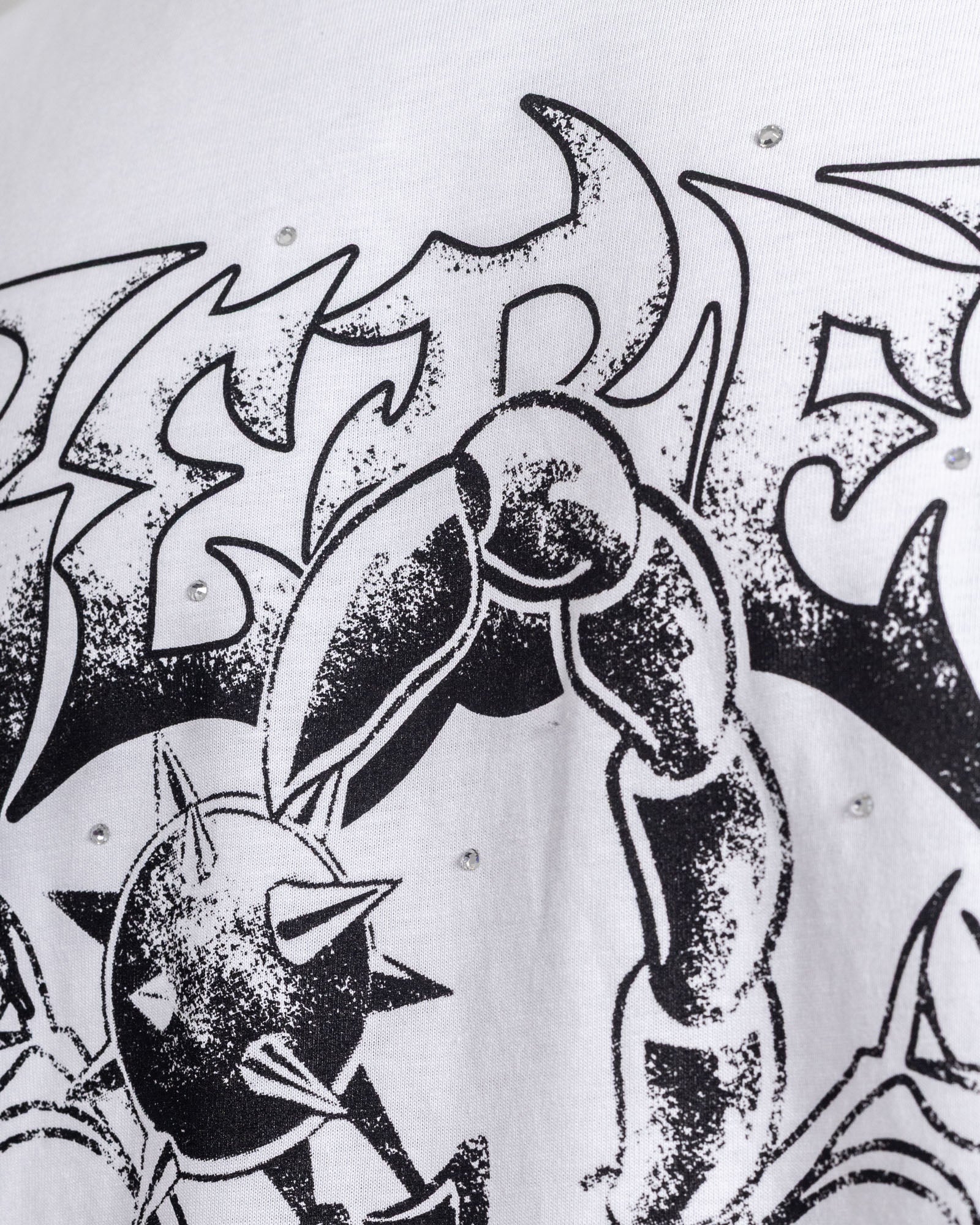 Camiseta oversize de alto impacto, confeccionada en algodón suave y resistente, con gráfico frontal estilo street-art y aplicación de piedrería que eleva el diseño con brillo sutil. Fit amplio, costuras visibles y acabados premium pensados para destacar en cualquier outfit urbano.