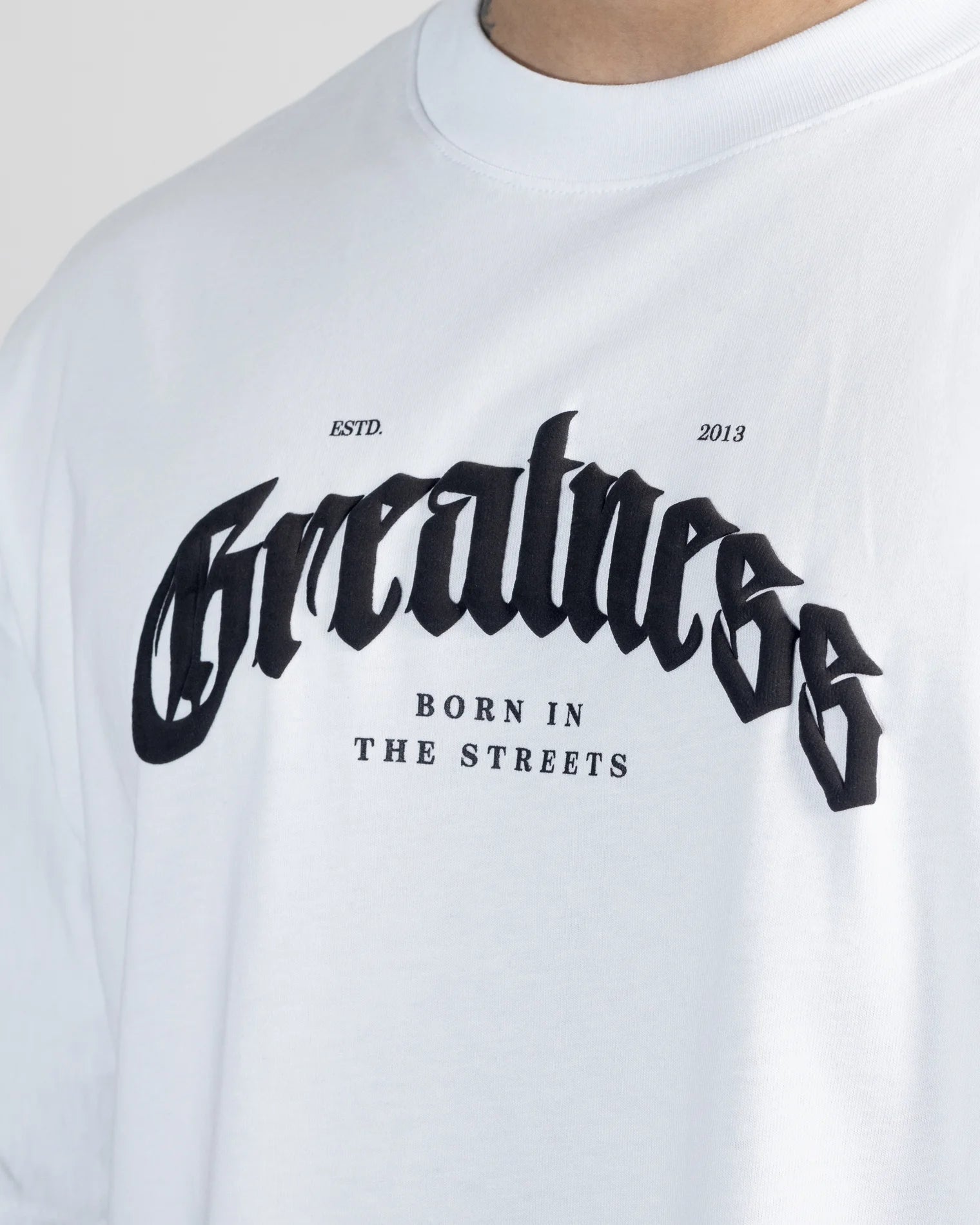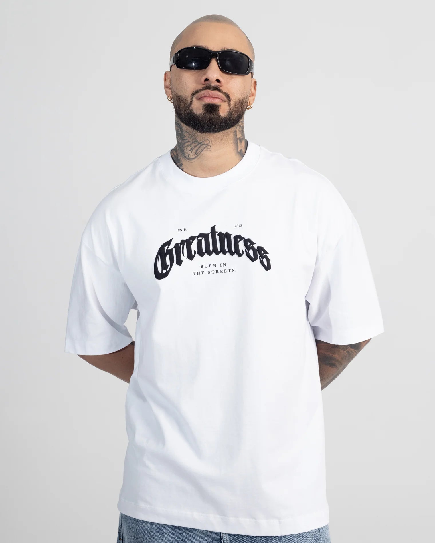 Camiseta oversize en algodón pesado, caída amplia y tacto suave. Gráfica frontal en tipografía gothic con efecto relieve high-density, y una ilustración trasera brutal inspirada en el street lifestyle: dinero, cadenas, cigarros y power rings. Un fit ancho, cómodo y con presencia.