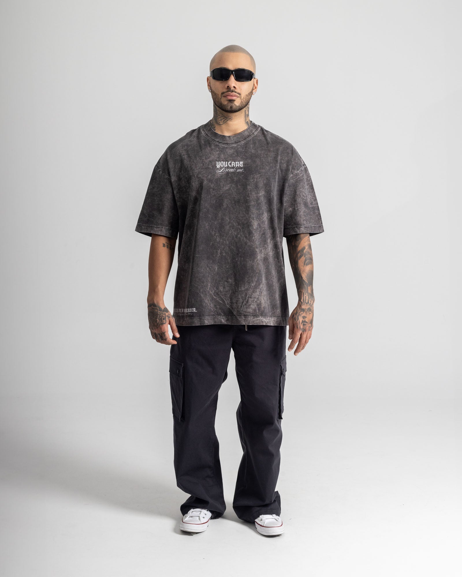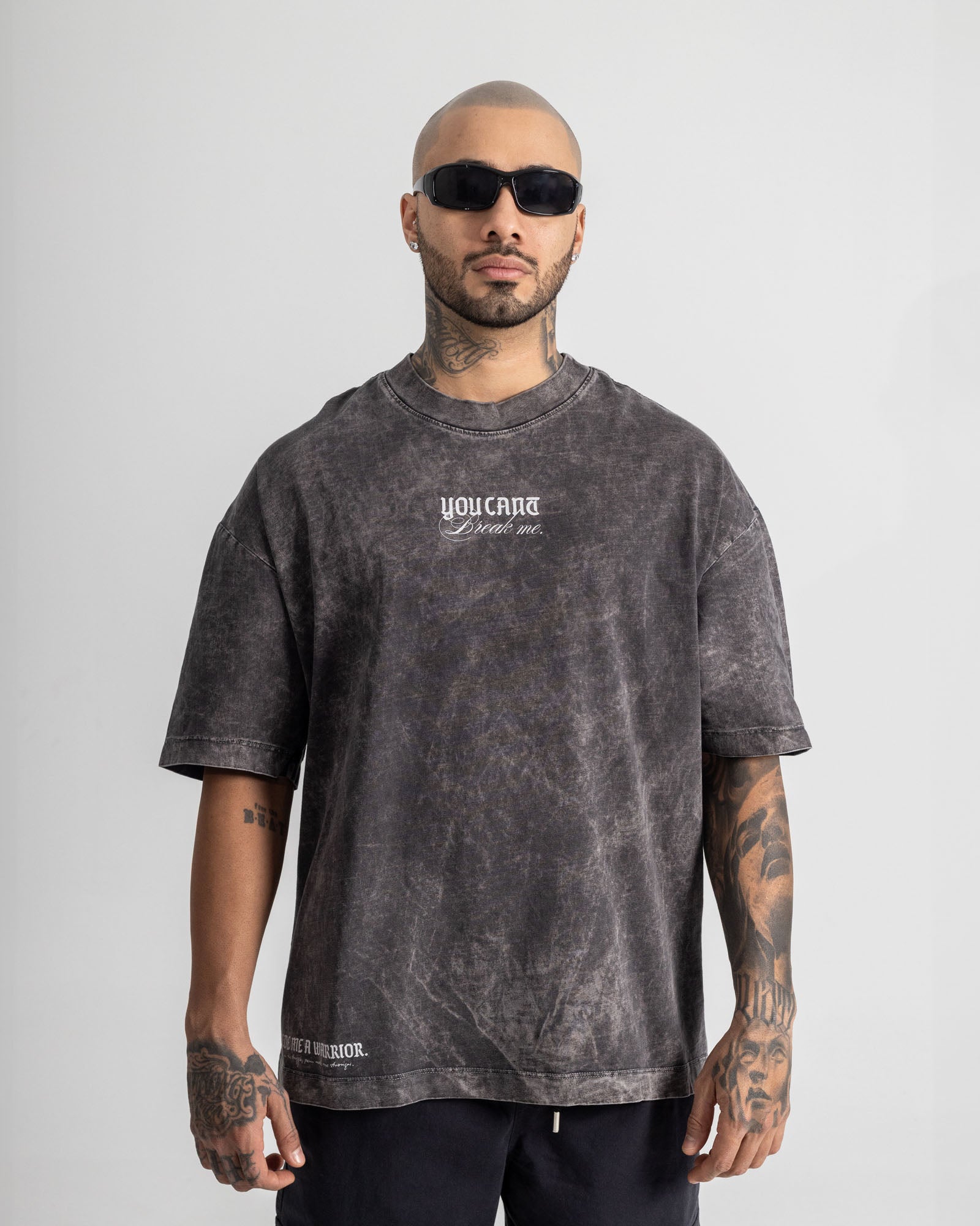 Camiseta oversize en algodón de alta calidad, con acabado lavado que le da un look vintage y urbano. Diseño gráfico de alto impacto en la espalda y detalle minimal en el frente, pensada para quienes llevan la calle como identidad. Fit amplio, cómodo y con carácter.