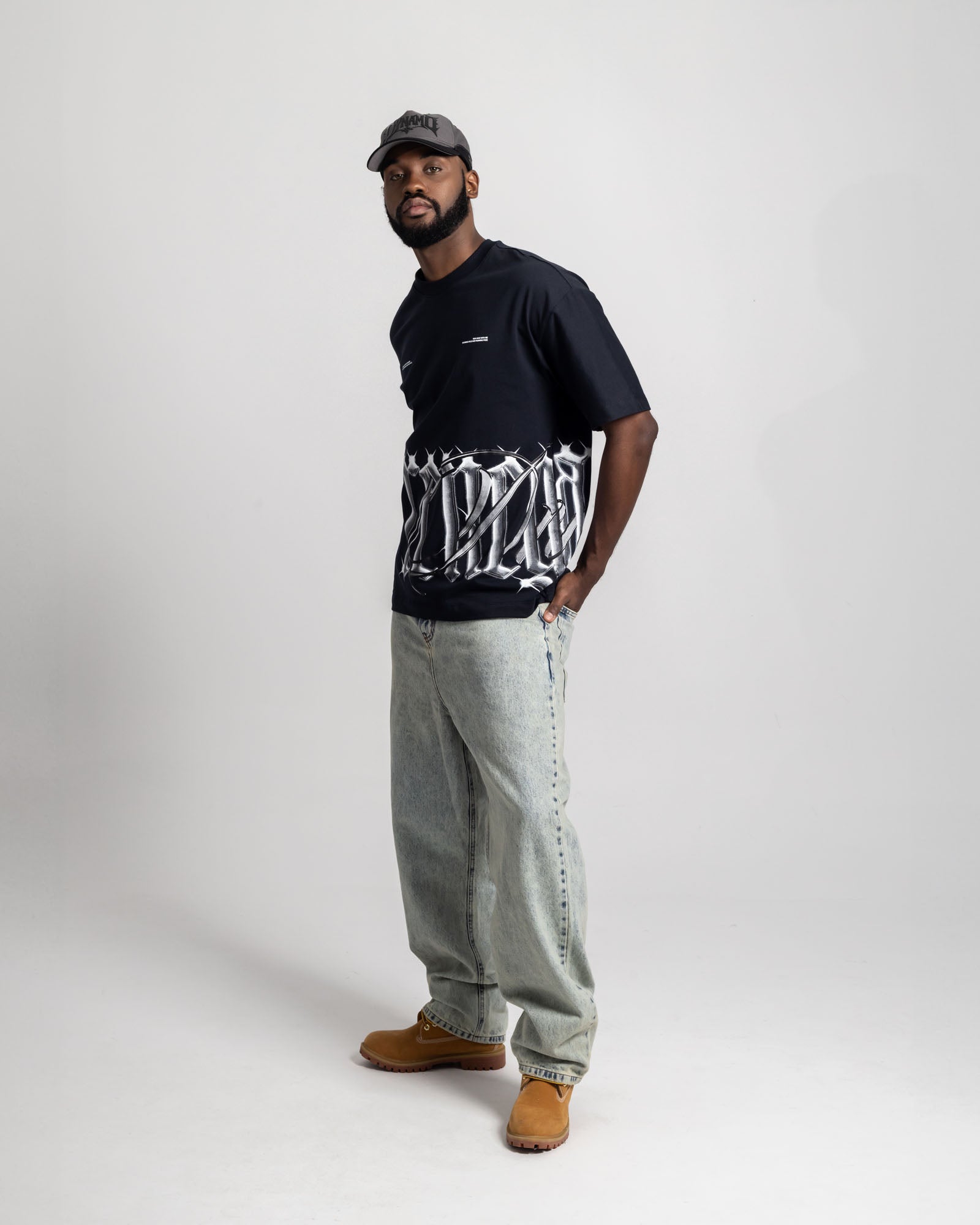 Camiseta oversize en algodón de alto gramaje con caída amplia y estructura firme. El degradado intenso y el gráfico frontal minimal contrastan con un print trasero dominante que eleva todo el outfit. Costuras reforzadas, tacto suave y cuello resistente que mantiene la forma. Una...