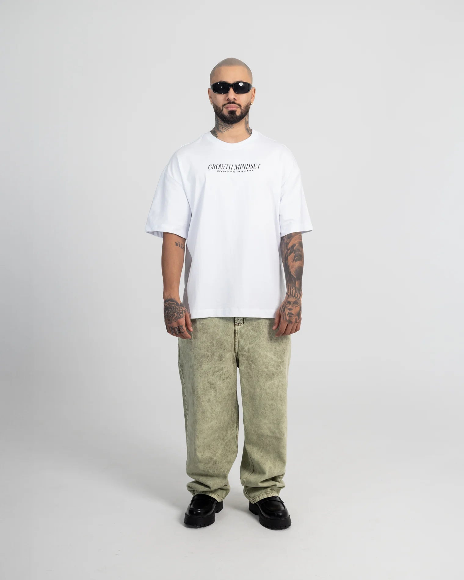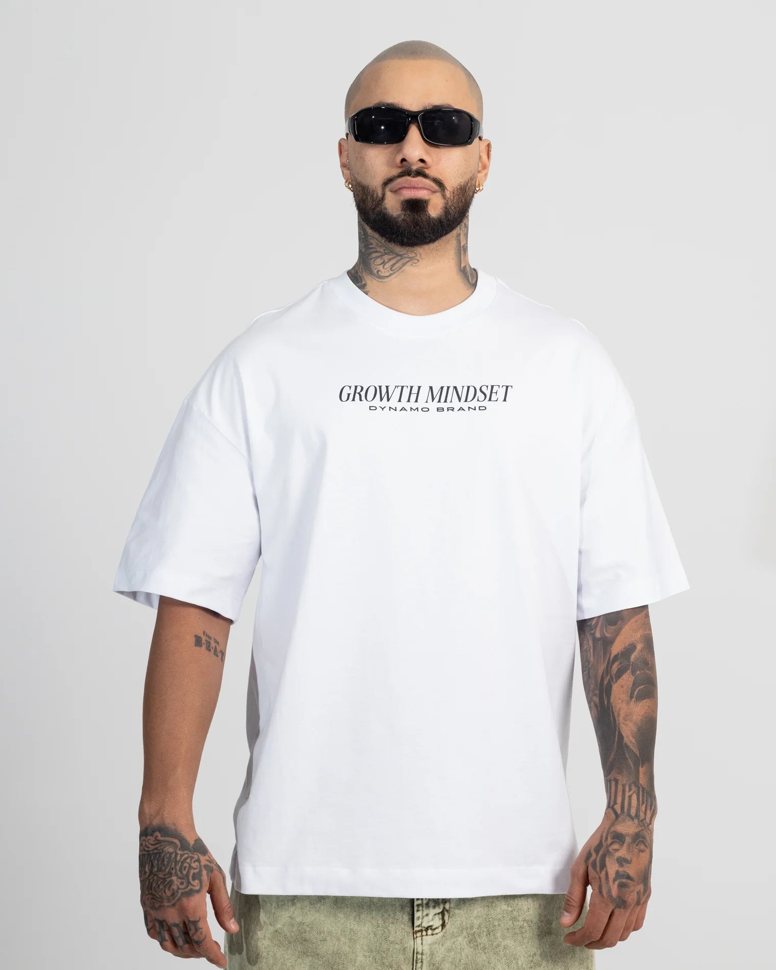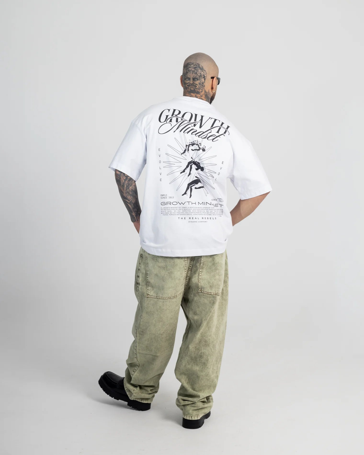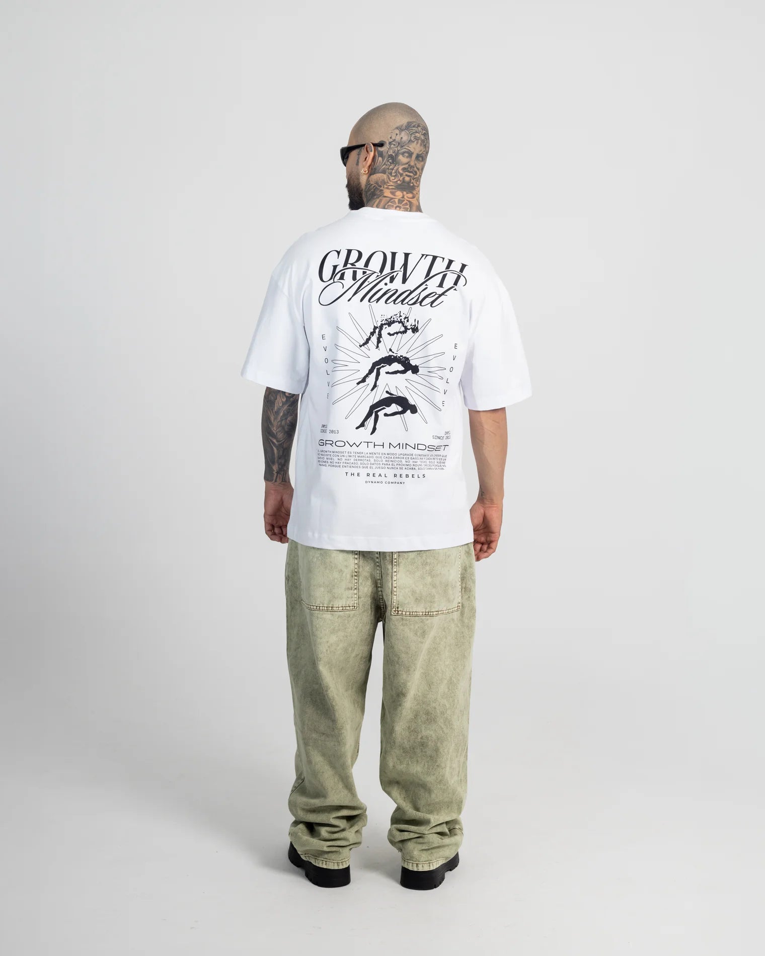 Camiseta oversize en algodón premium, con caída amplia y estructura firme. El frente lleva un estampado Growth Mindset en textura high-density que genera un relieve limpio y elegante. La espalda rompe con fuerza: gráfica evolutiva estilo rebel–art, líneas energéticas y composición editorial que refuerza el mensaje de evolución constante. Un fit amplio, cómodo y con presencia real de calle.