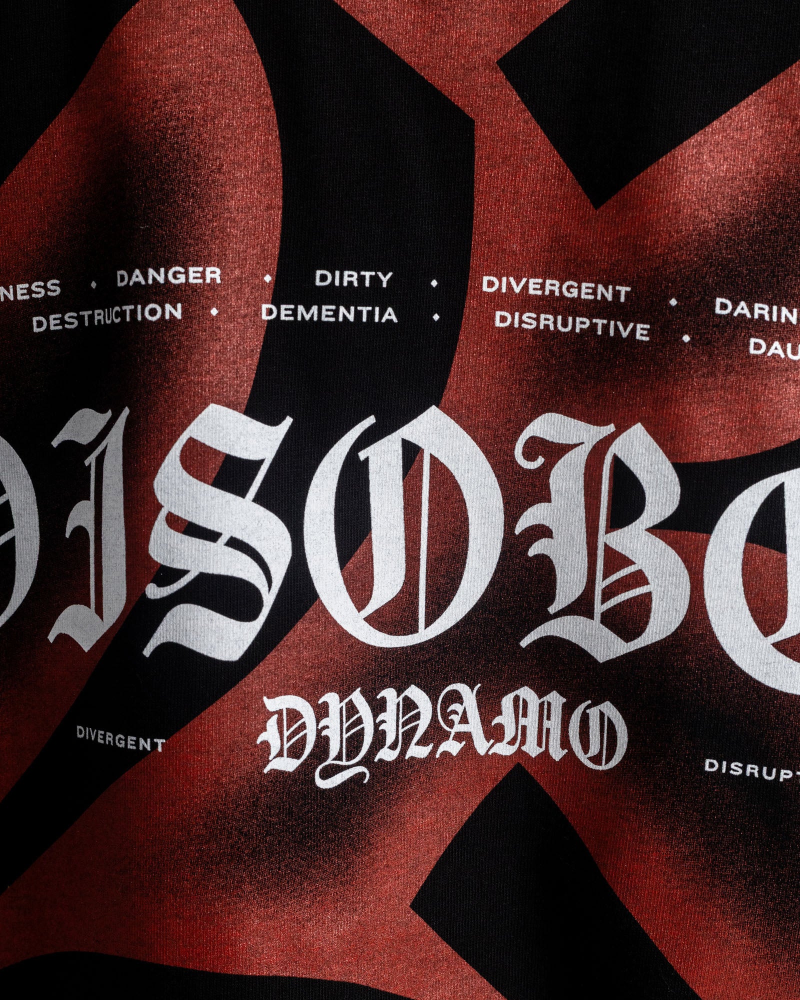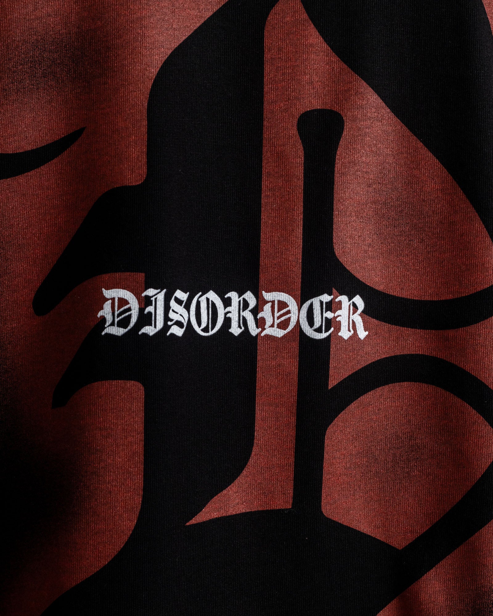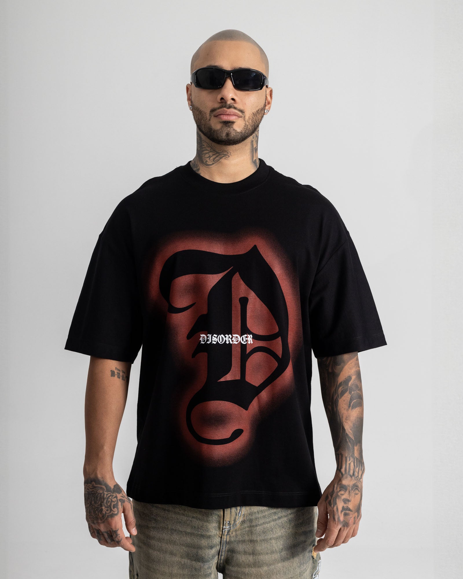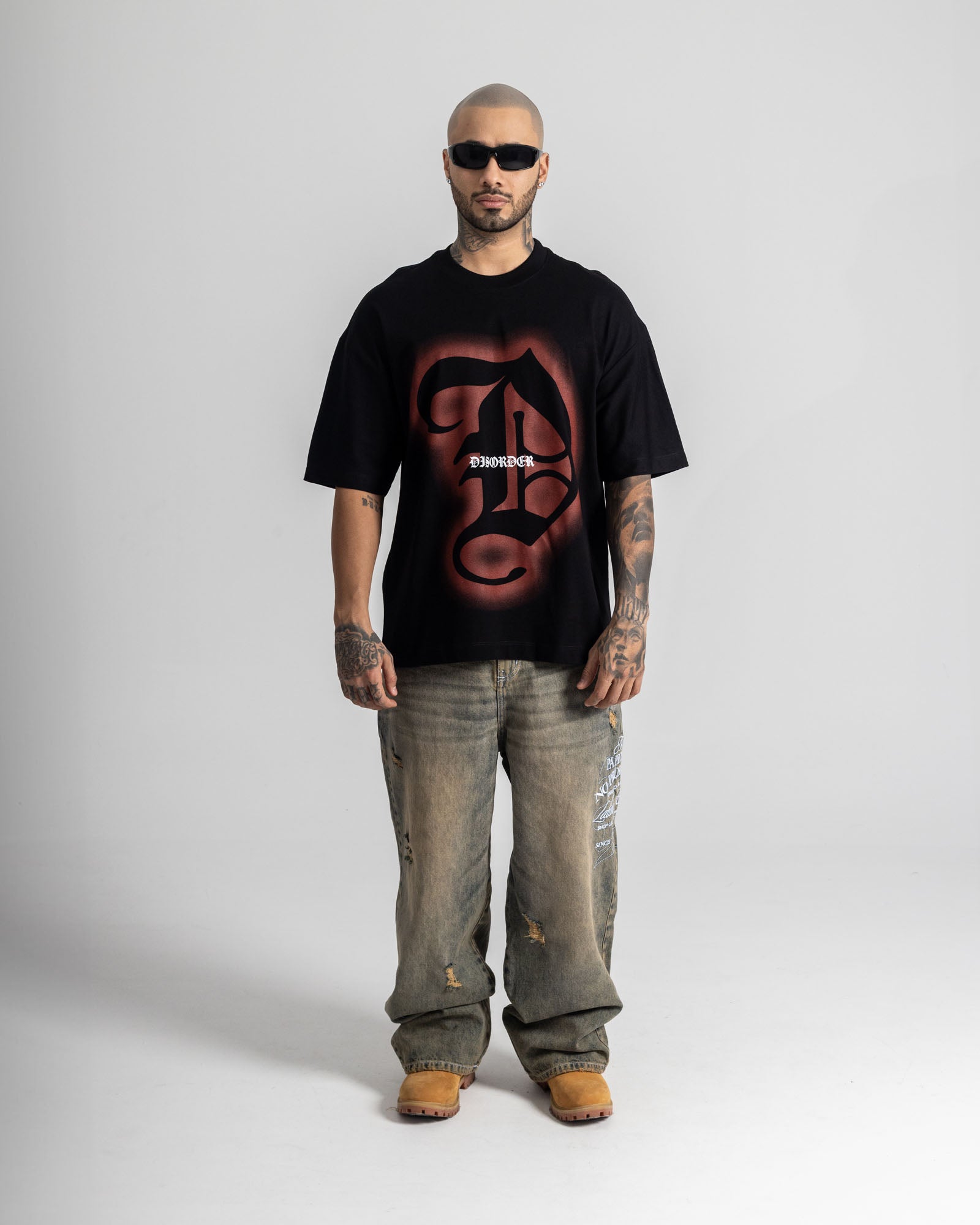 Camiseta oversize de silueta amplia y caída pesada, confeccionada en algodón de alta calidad. Diseño frontal con tipografía gótica y efecto degradado en rojo, acompañado de un estampado posterior de alto impacto que refuerza el ADN dark street.