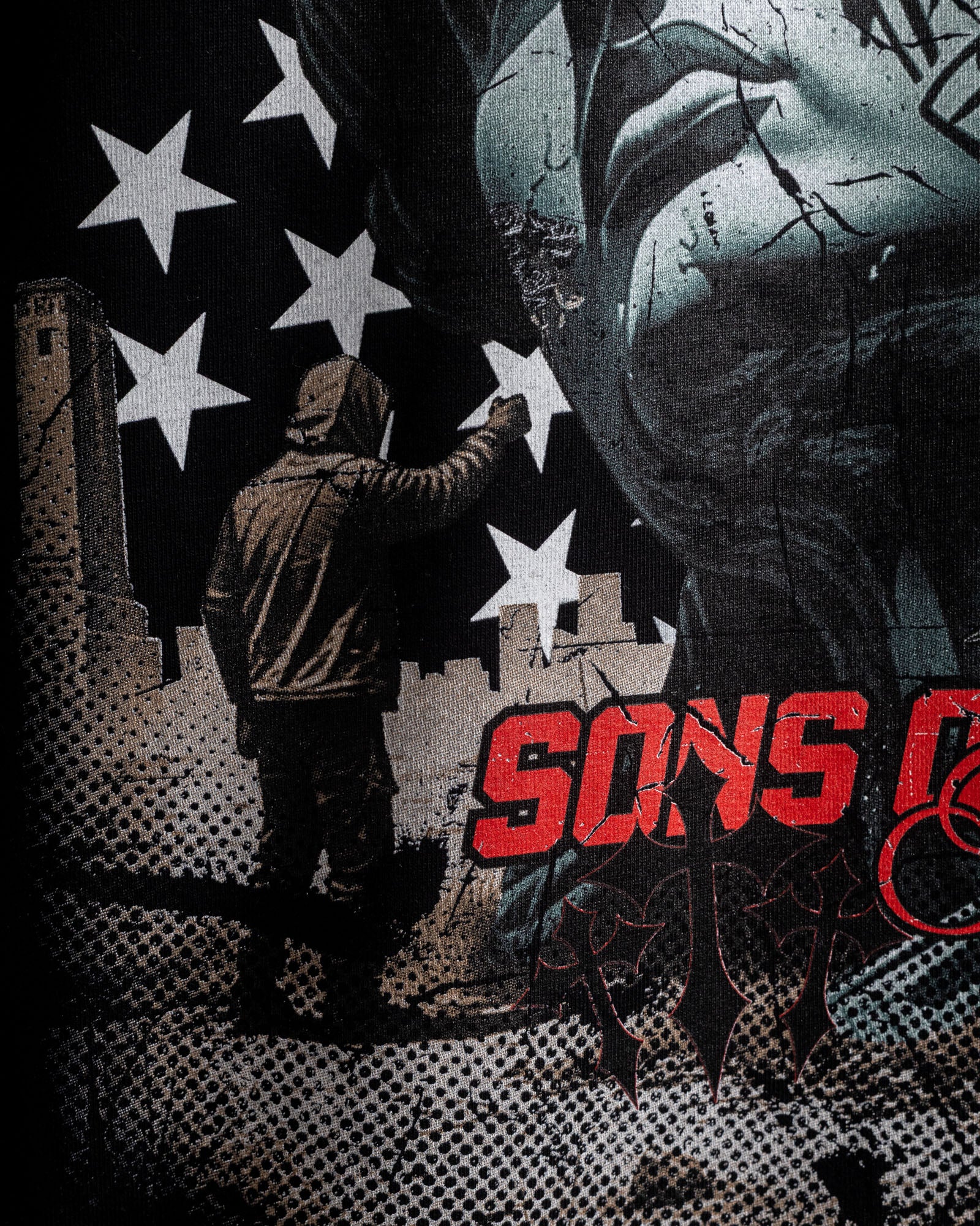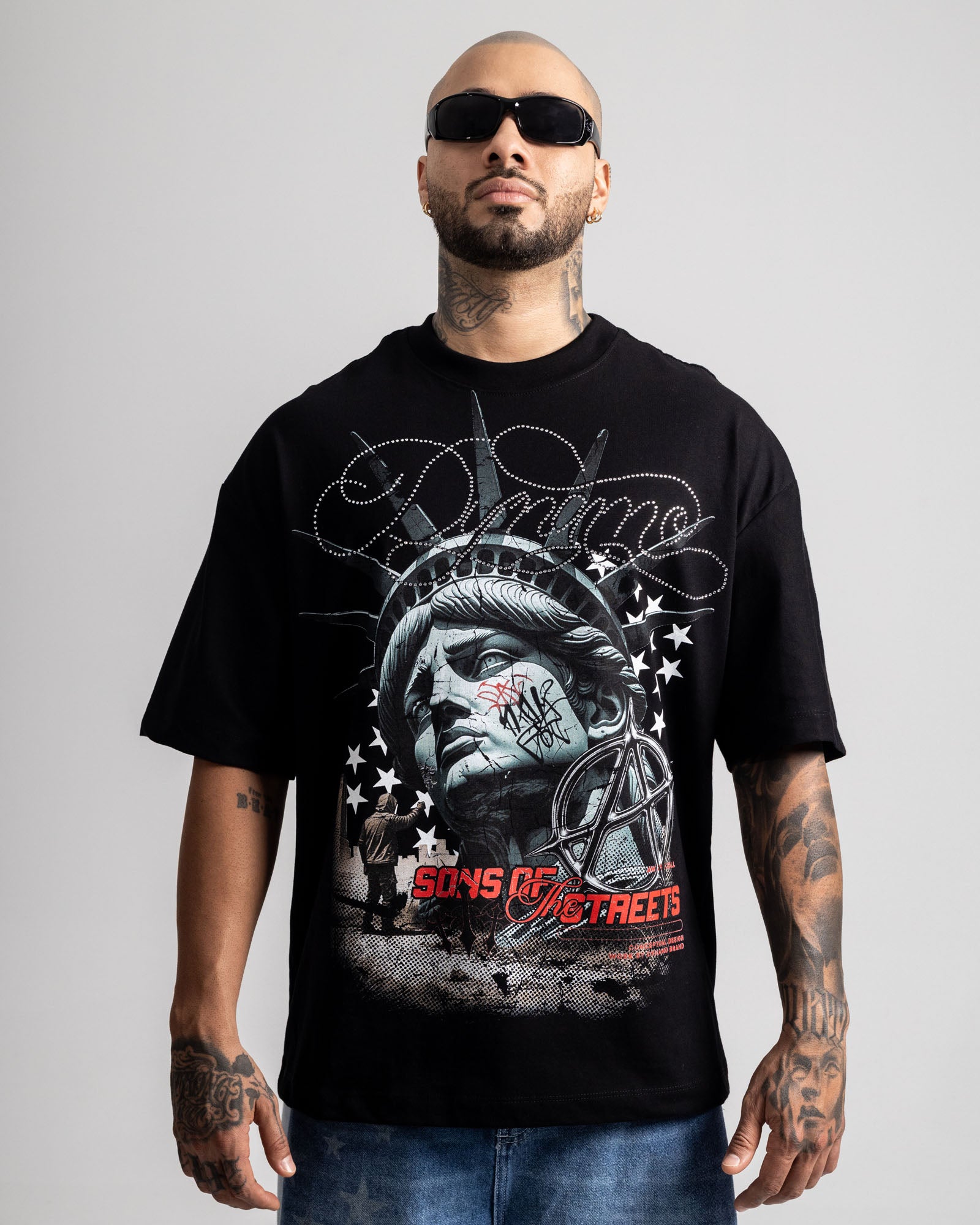 Camiseta oversize de silueta amplia y caída pesada, inspirada en la Estatua de la Libertad como símbolo de rebeldía, calle y voz propia. Confeccionada en algodón de alto gramaje, cuello reforzado y mangas sueltas para un fit contundente. El gráfico frontal de alto impacto y los detalles traseros refuerzan la identidad street y el mensaje de libertad