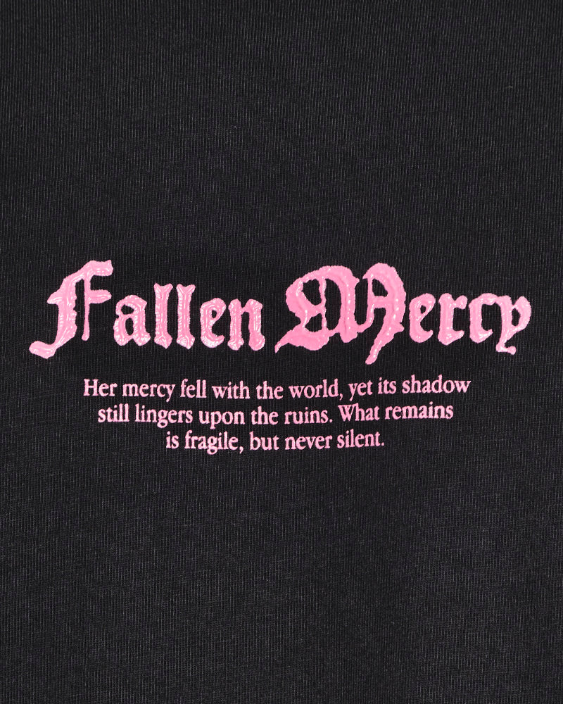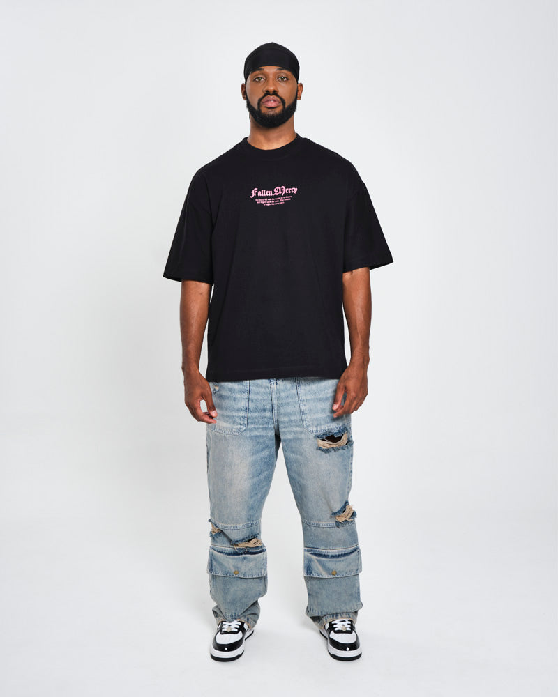 Camiseta oversize negra en algodón de alto gramaje, con fit amplio y estructura firme que aporta presencia y caída perfecta. Estampado trasero gráfico de gran formato con estética religiosa reinterpretada en estilo urbano, tonos rosados eléctricos y detalles tipo rayo que elevan el contraste sobre la base textil premium. Cuello redondo reforzado y costuras resistentes para máxima durabilidad.