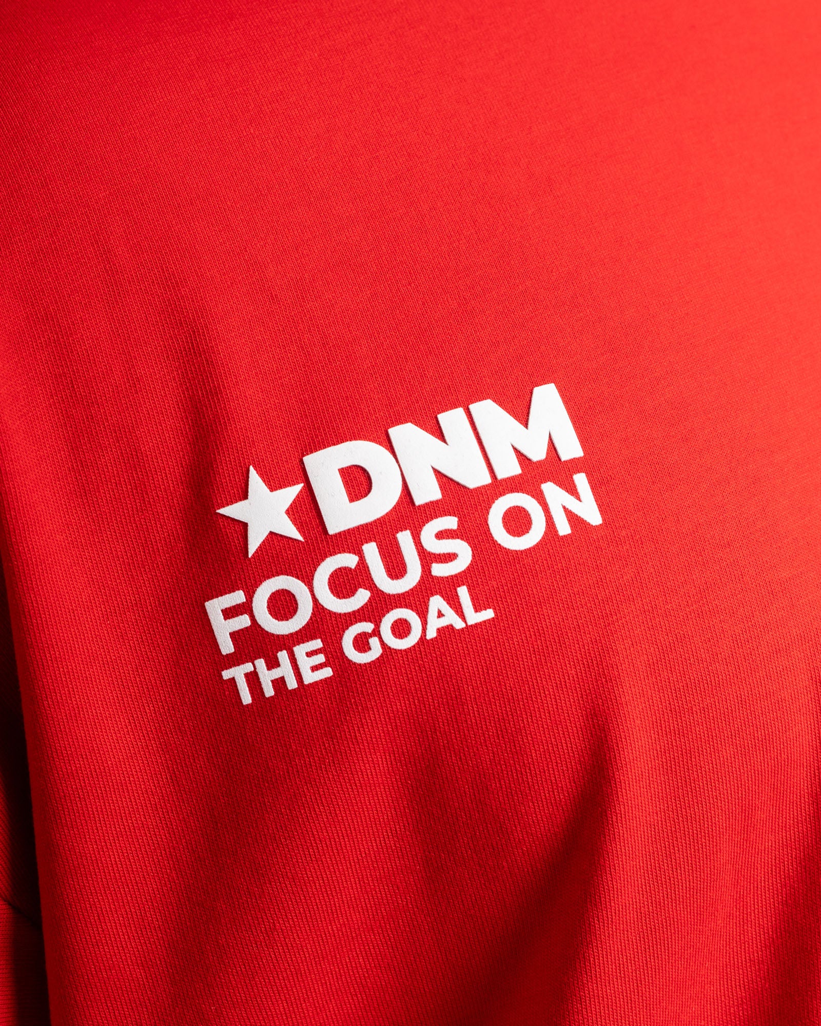 Camiseta oversize en tono rojo intenso, diseñada para los que viven en modo enfoque total. Confeccionada en algodón de alto gramaje, ofrece una caída pesada y fit amplio que marca presencia. Estampado frontal minimal y gráfico posterior protagonista con mensaje de mentalidad ganadora, donde algunas letras en relieve aportan textura y fuerza visual. Una pieza streetwear hecha para destacar, imponer y avanzar