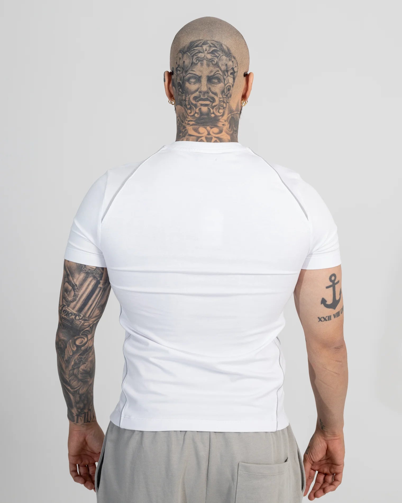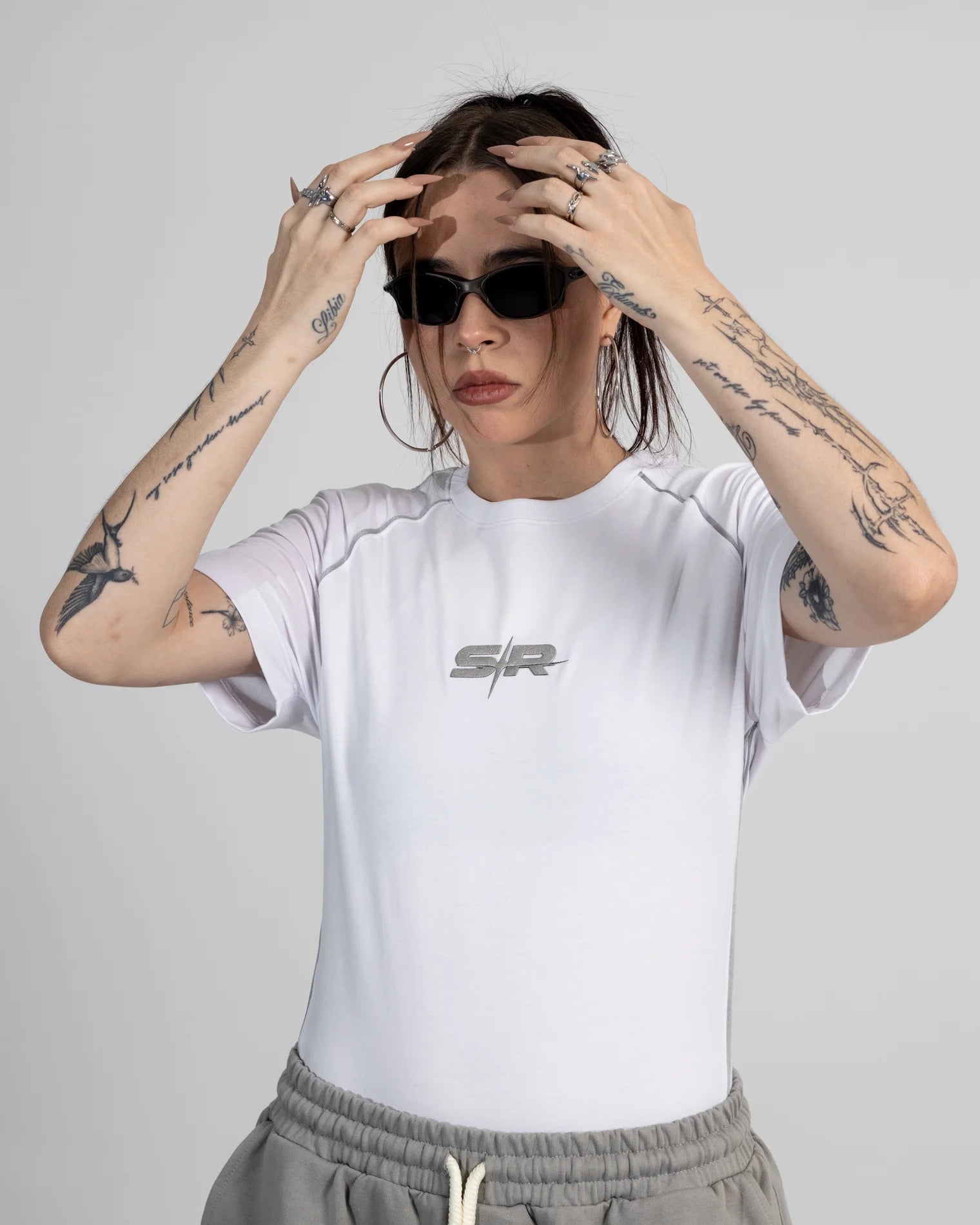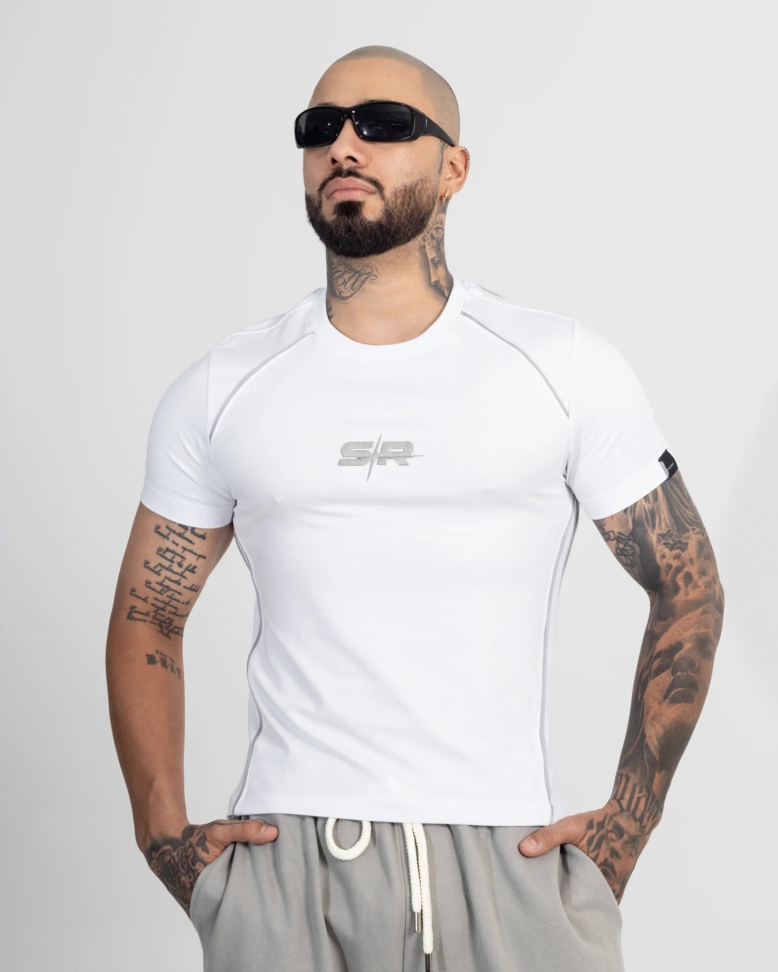 Camiseta regular de ajuste definido con base textil suave y elástica que resalta la estructura del torso sin perder comodidad. Costuras expuestas en contraste que enmarcan la silueta y logo SR en el pecho con acabado metálico que aporta un vibe deportivo–street