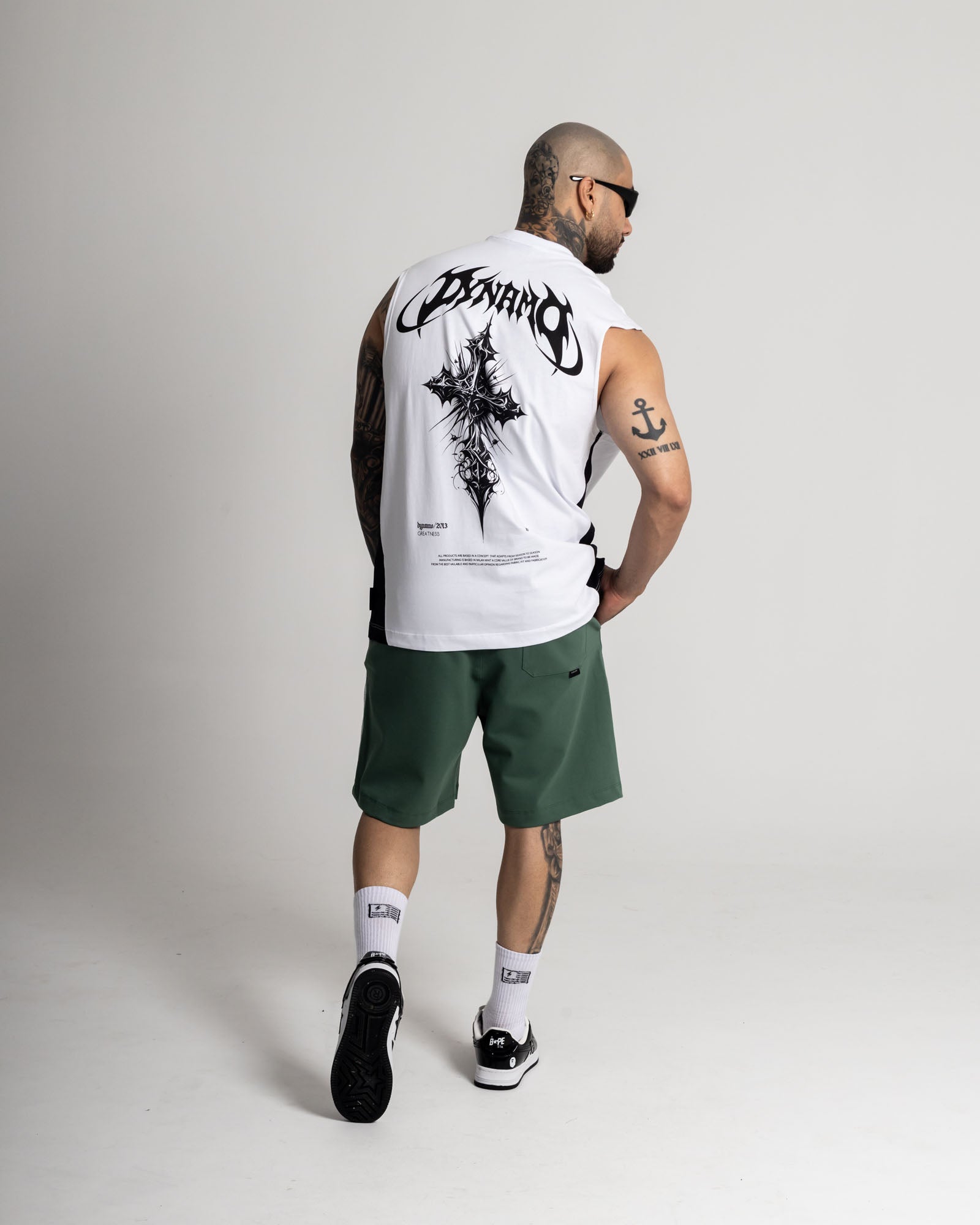 Camisilla regular en algodón de tacto suave y estructura firme. Lleva un estampado trasero de cruz en trazos finos y detallados, acompañado del logotipo de Dynamo en estilo gráfico. Corte clásico, cuello redondo y acabados resistentes que mantienen la forma. Ideal para quienes buscan una prenda ligera con diseño marcado y estética gráfica.