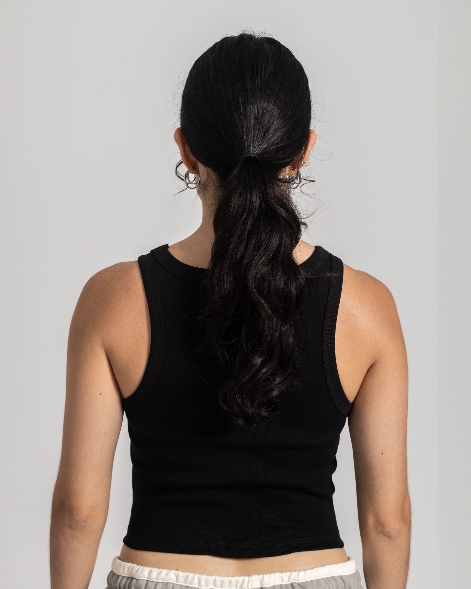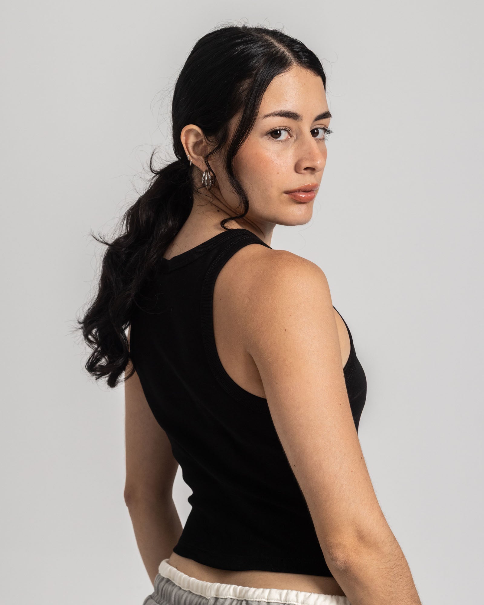 Crop top de silueta ajustada con vibe urbano. Confeccionado en base textil acanalada, suave y flexible, que se adapta al cuerpo resaltando la forma sin perder comodidad. Diseño limpio, cuello cerrado y sisas amplias para un look street, minimal y poderoso.