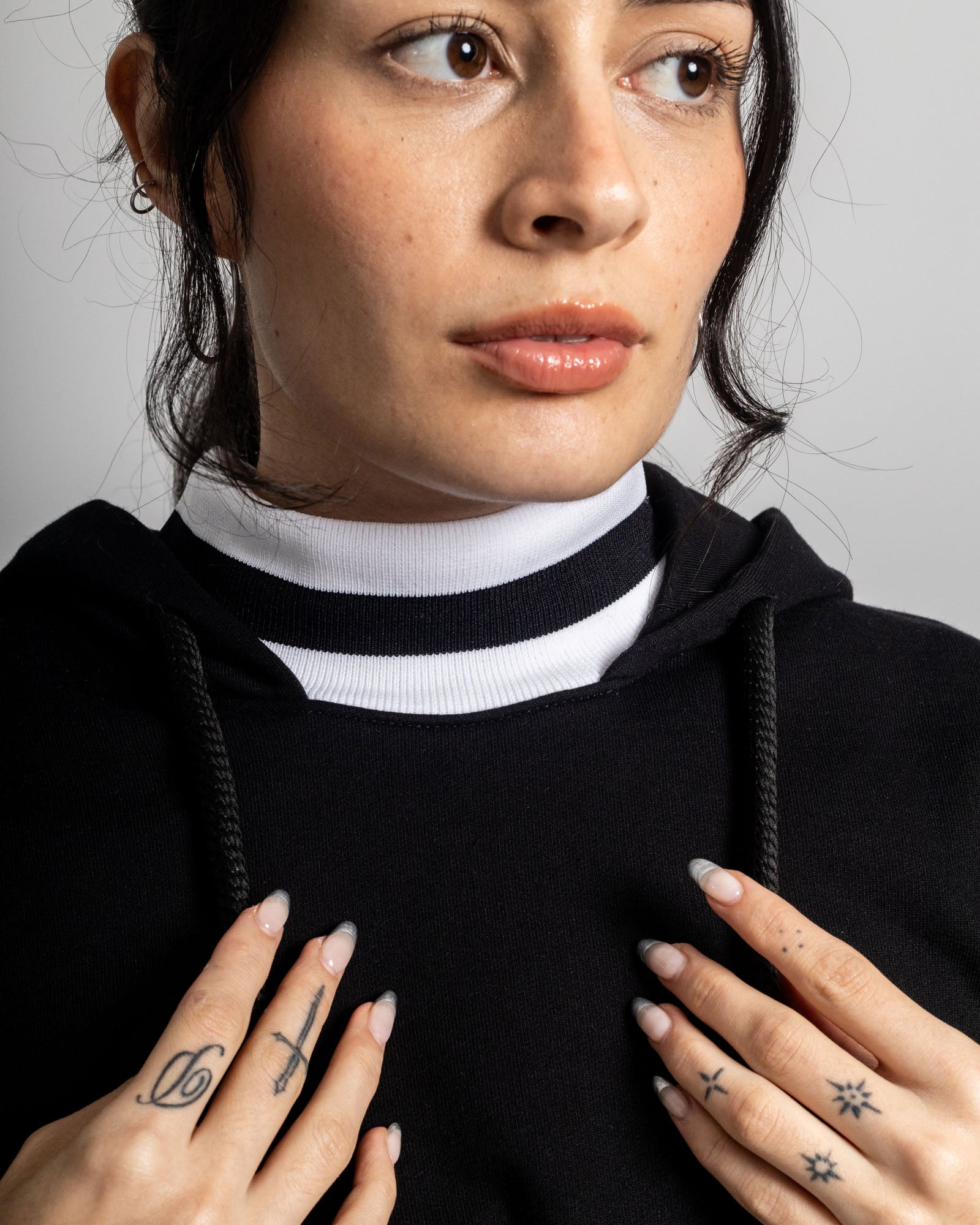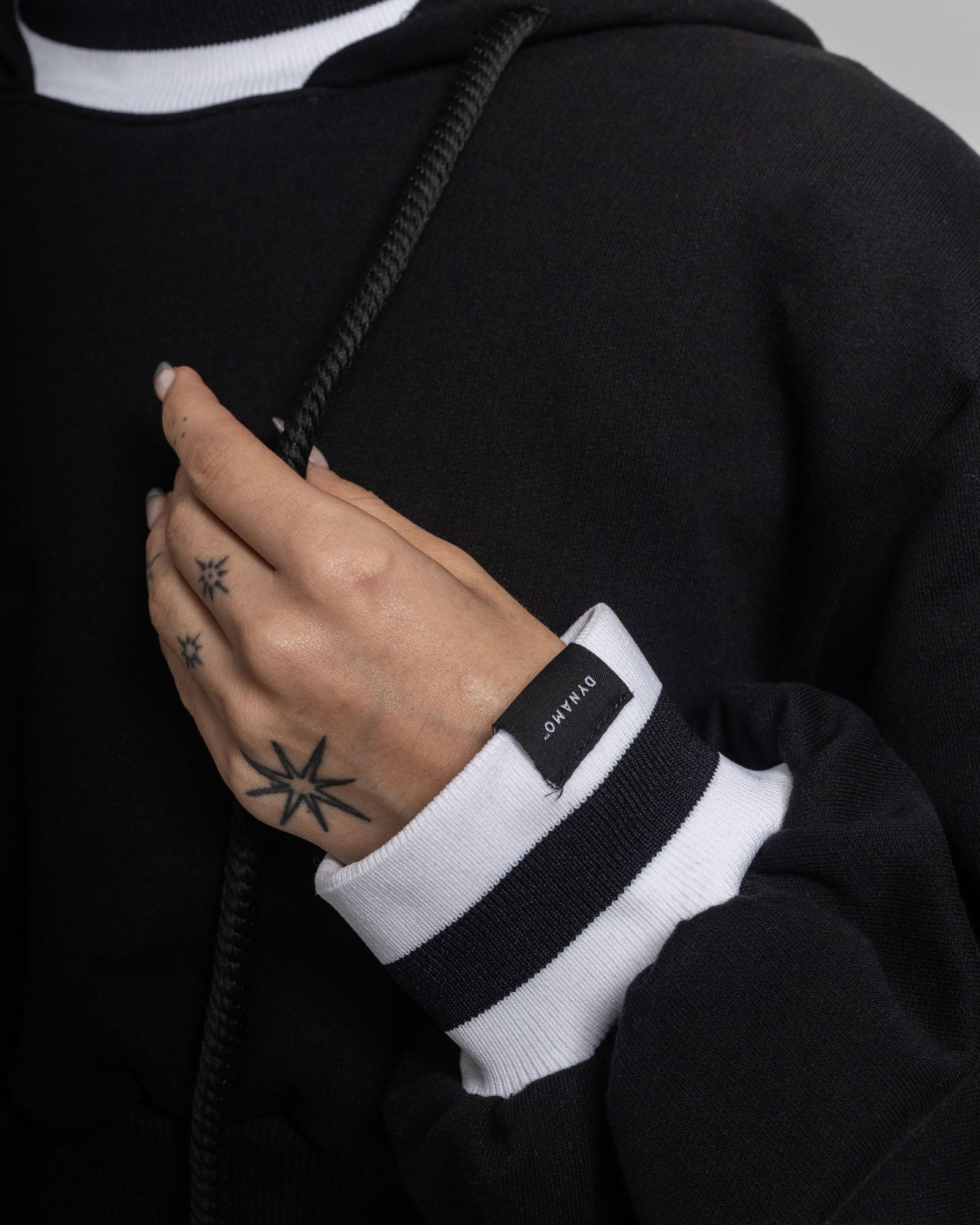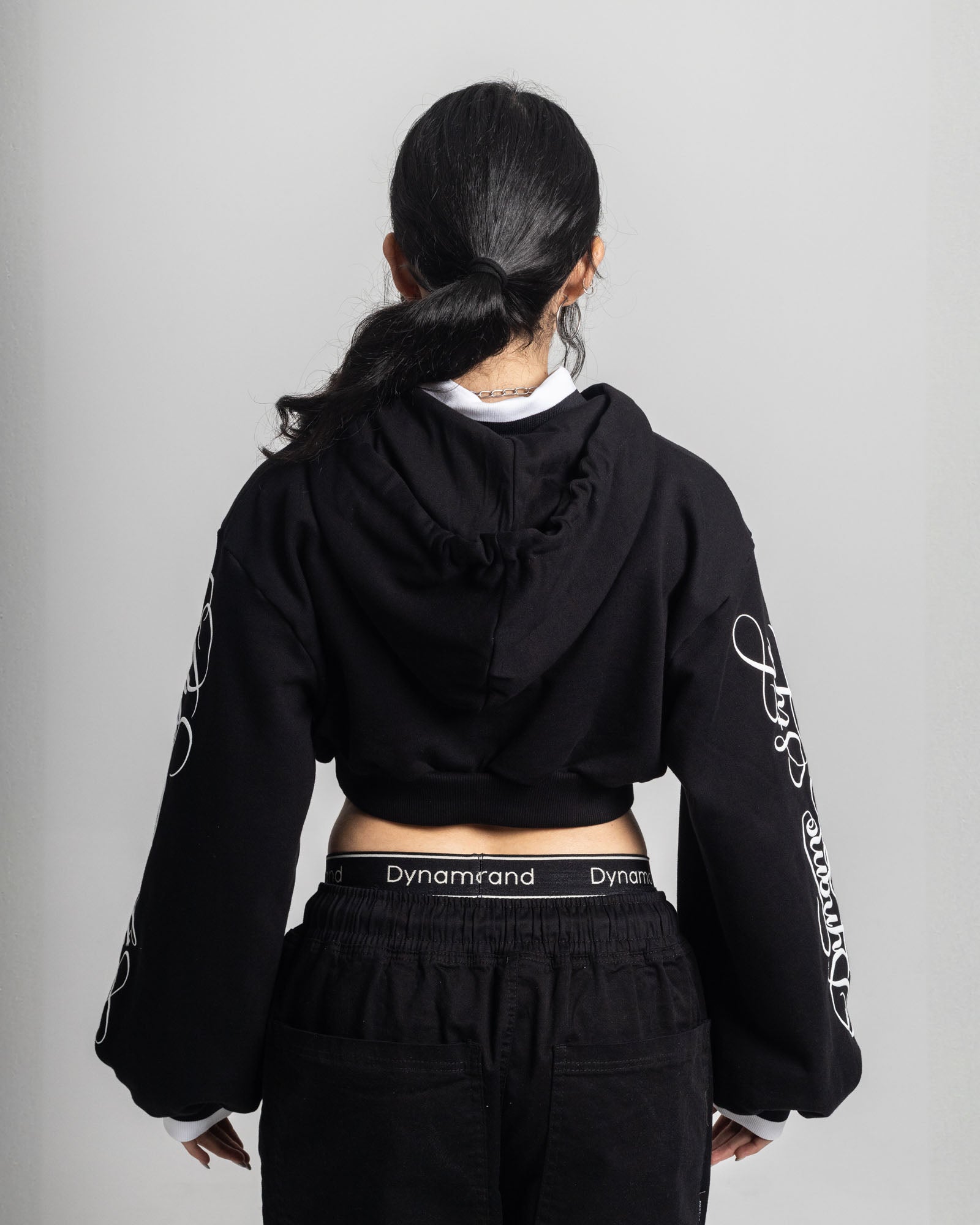 Crop top manga larga, de silueta corta y fit relajado, confeccionado en algodón perchado de alta calidad. Su diseño incorpora capucha embonada, cuello estructurado similar a cuello cerrado que aporta un look más pulido y urbano, manga larga con estampado gráfico y rib ancho en cintura para mejor ajuste. Una pieza statement que eleva el streetwear con identidad Dynamo.