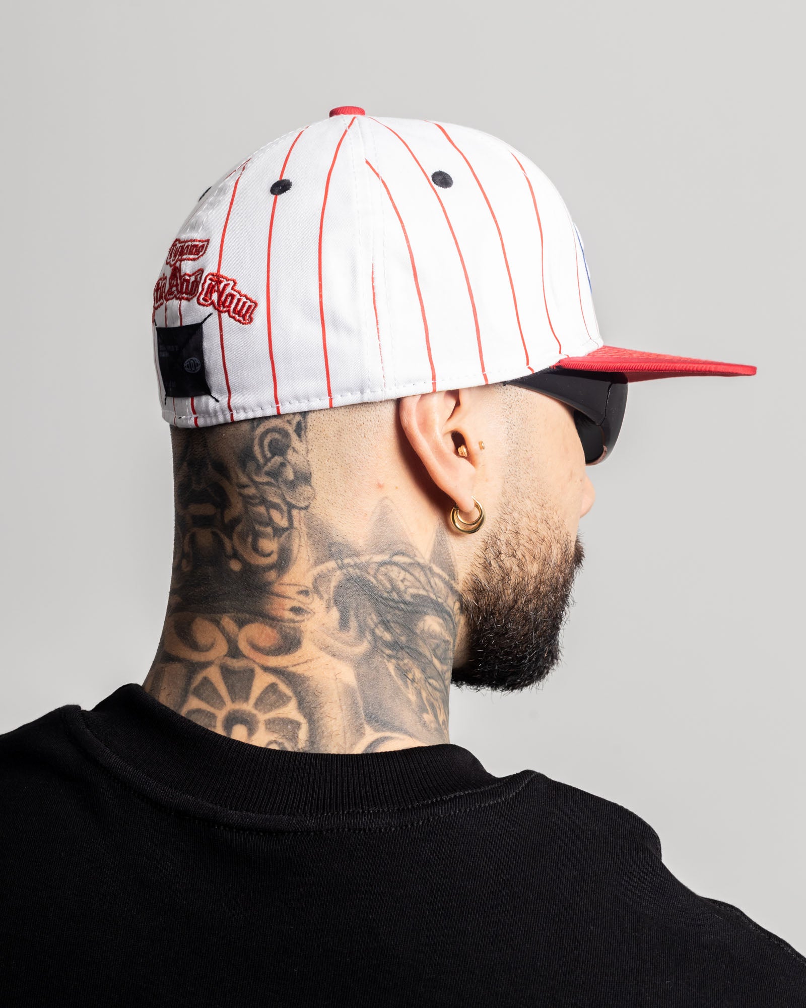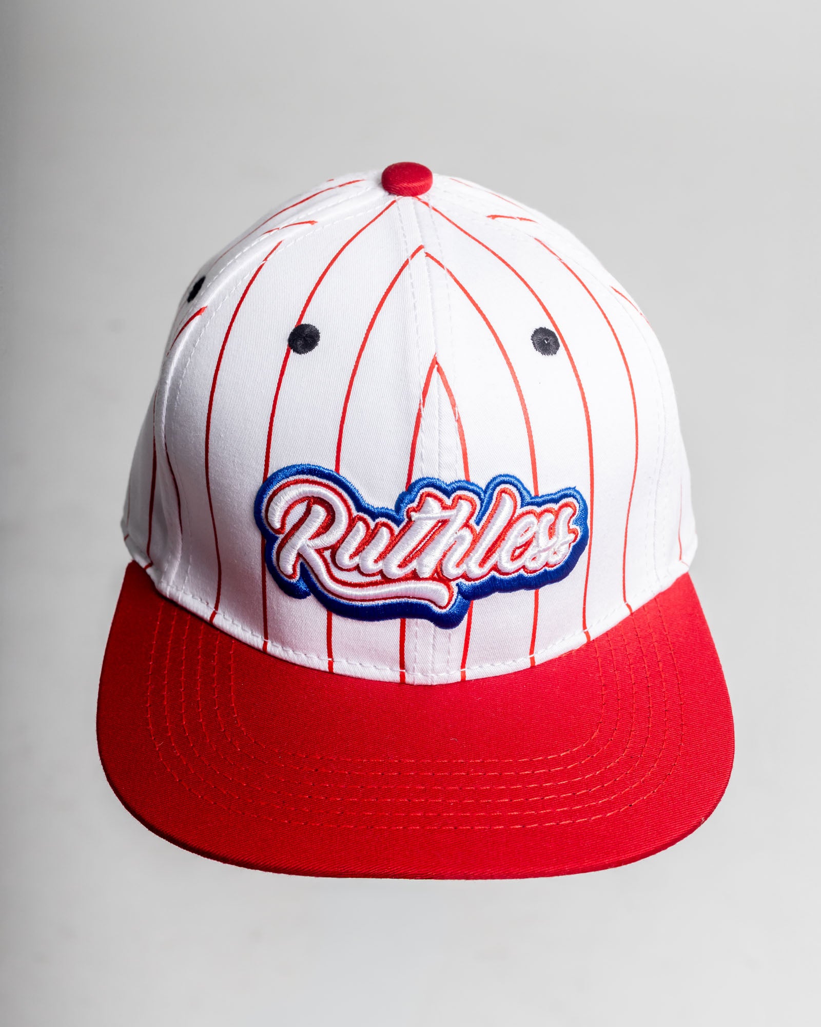 Gorra estilo varsity con franjas verticales rojas, hecha en algodón estructurado para un fit firme y duradero. Visera roja de alto impacto y bordado frontal Ruthless en 3D y un ajuste trasero regulable.
