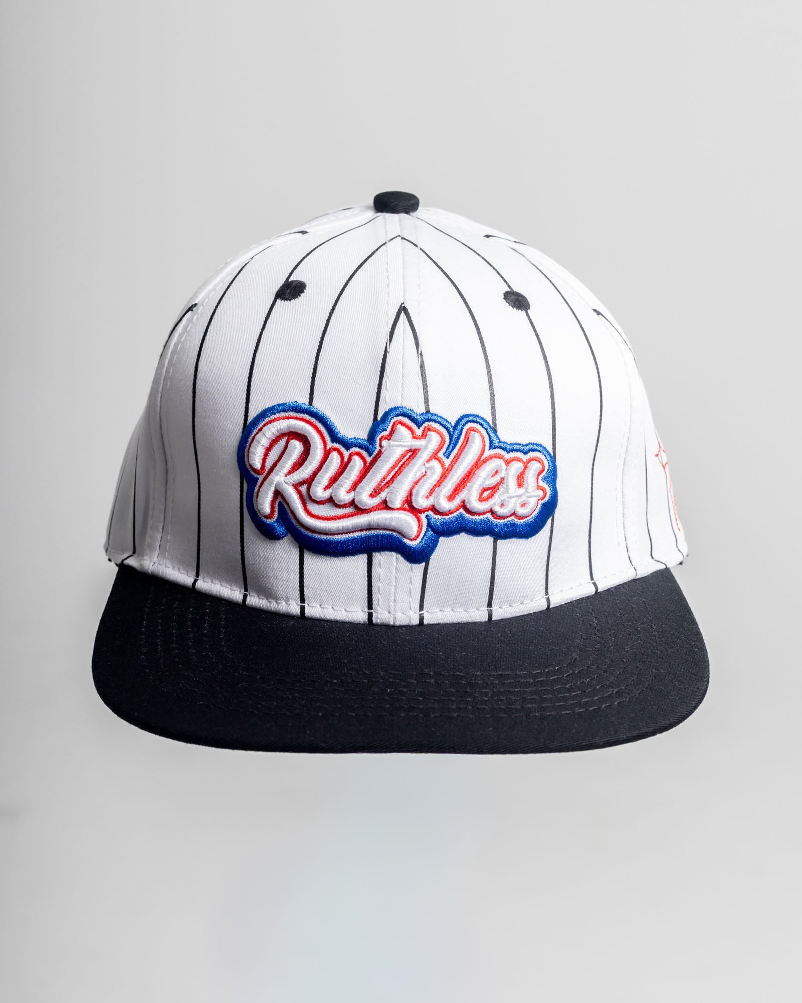 Gorra estilo baseball con franjas verticales negras, confeccionado para looks limpios y callejeros. Cuenta con visera negra de alto contraste y un bordado 3D Ruthless que marca presencia. Ojales bordados, corona estructurada y cierre trasero ajustable.