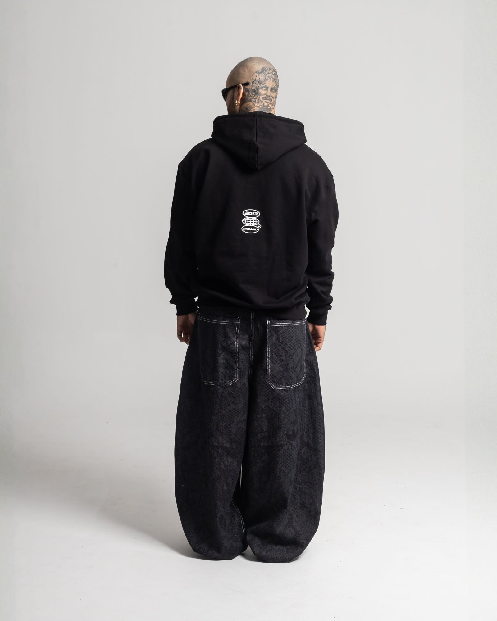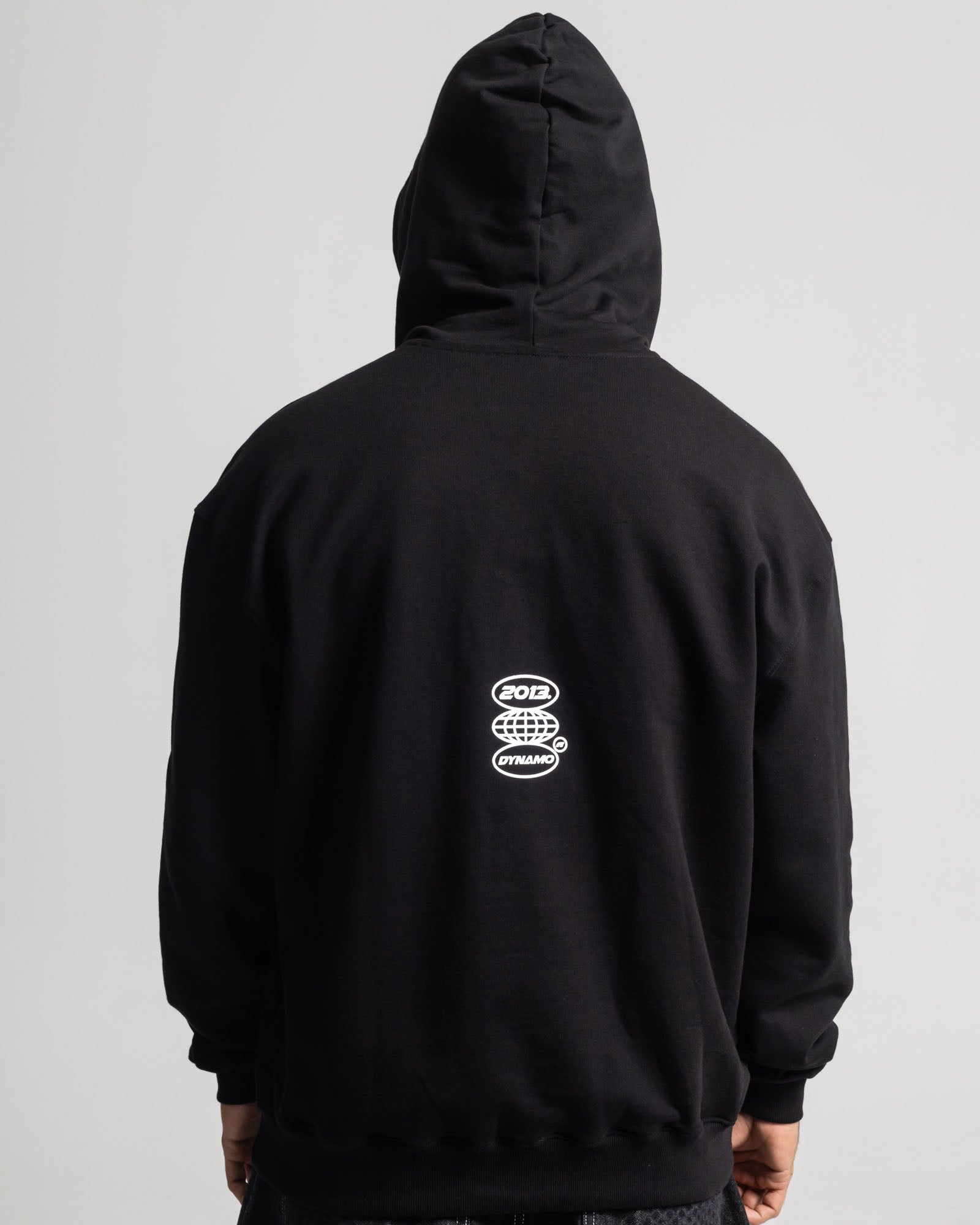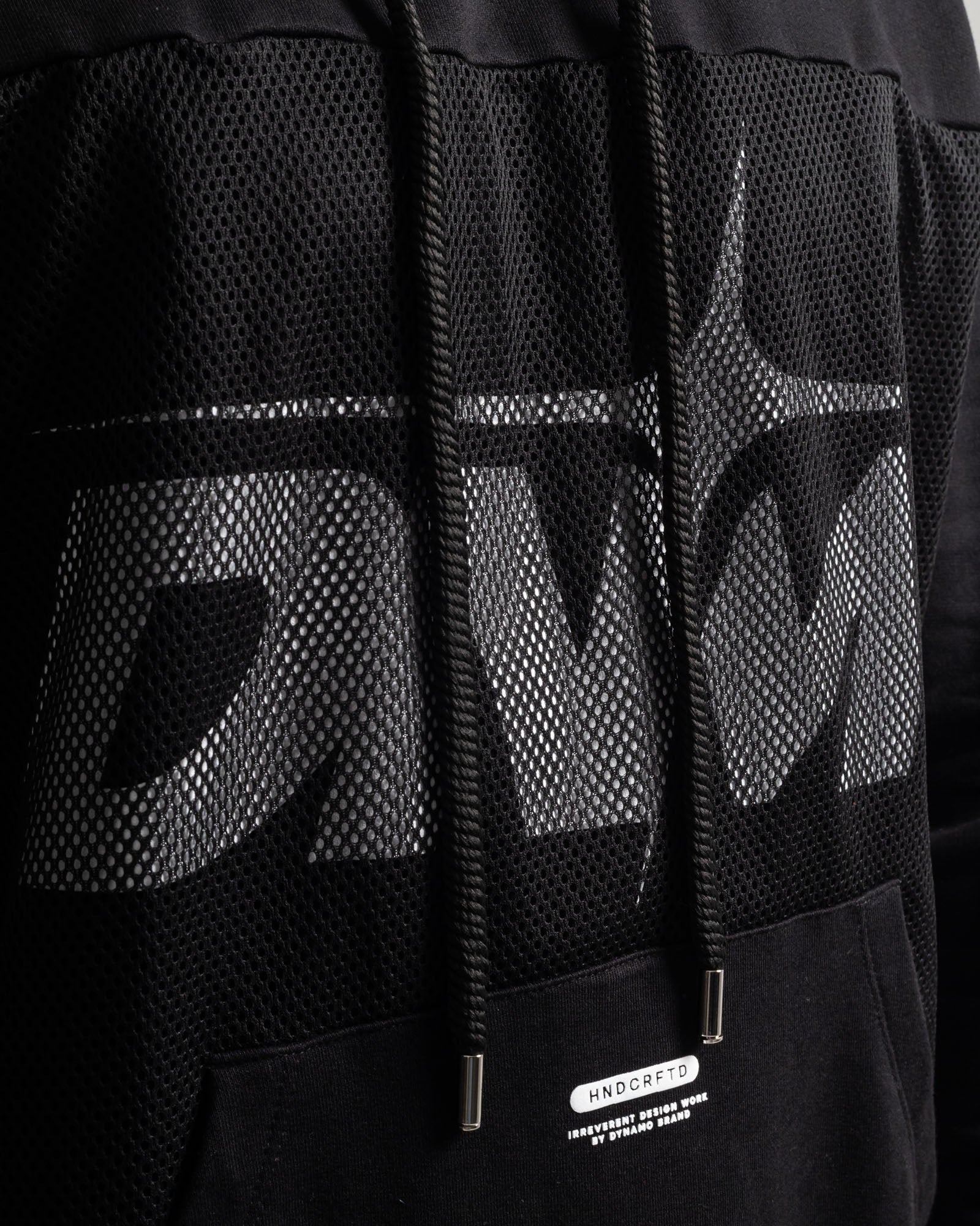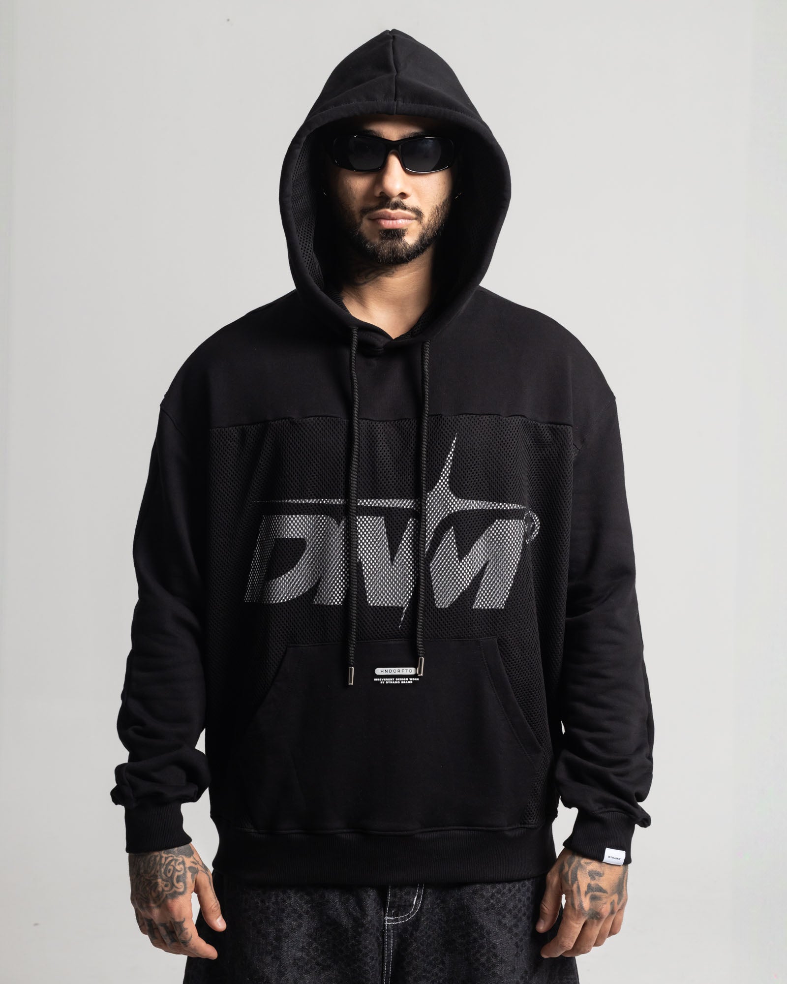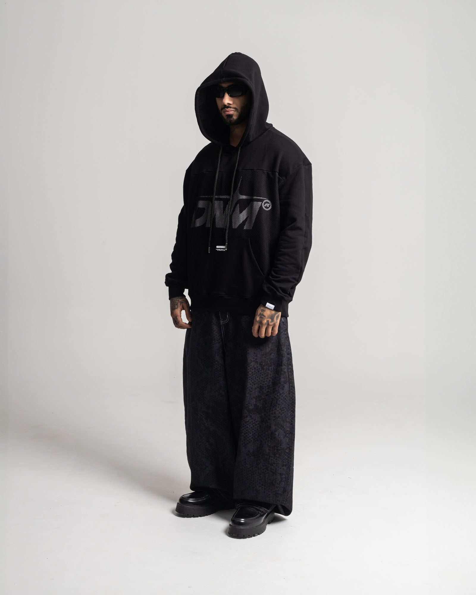 Hoodie oversize en algodón grueso con caída pesada y presencia fuerte. Gráficos DNM en pecho y espalda que dominan la prenda con un estilo bold y pulido. La capucha profunda, el bolsillo canguro y los cordones contrastados le dan un vibe urbano y activo.
