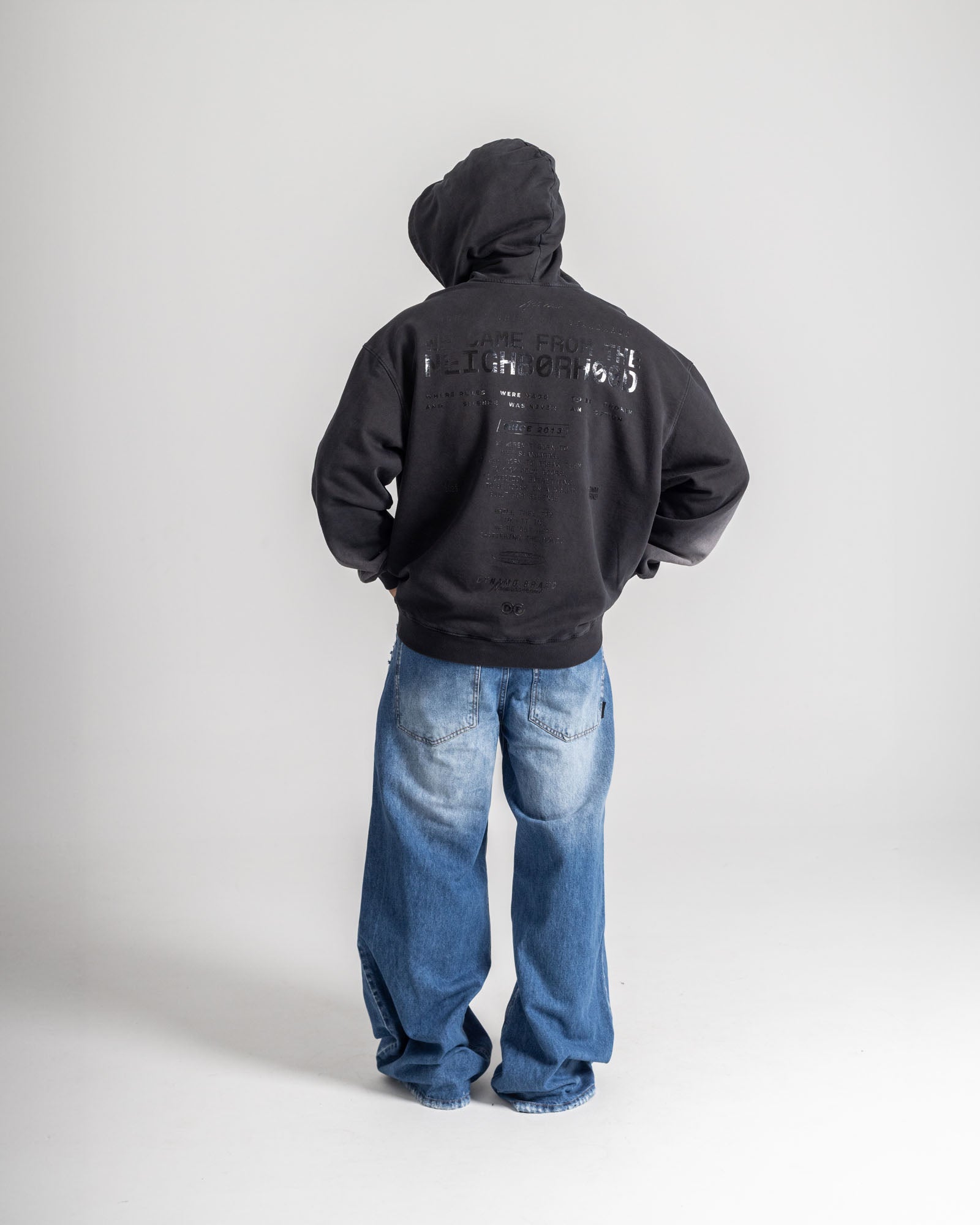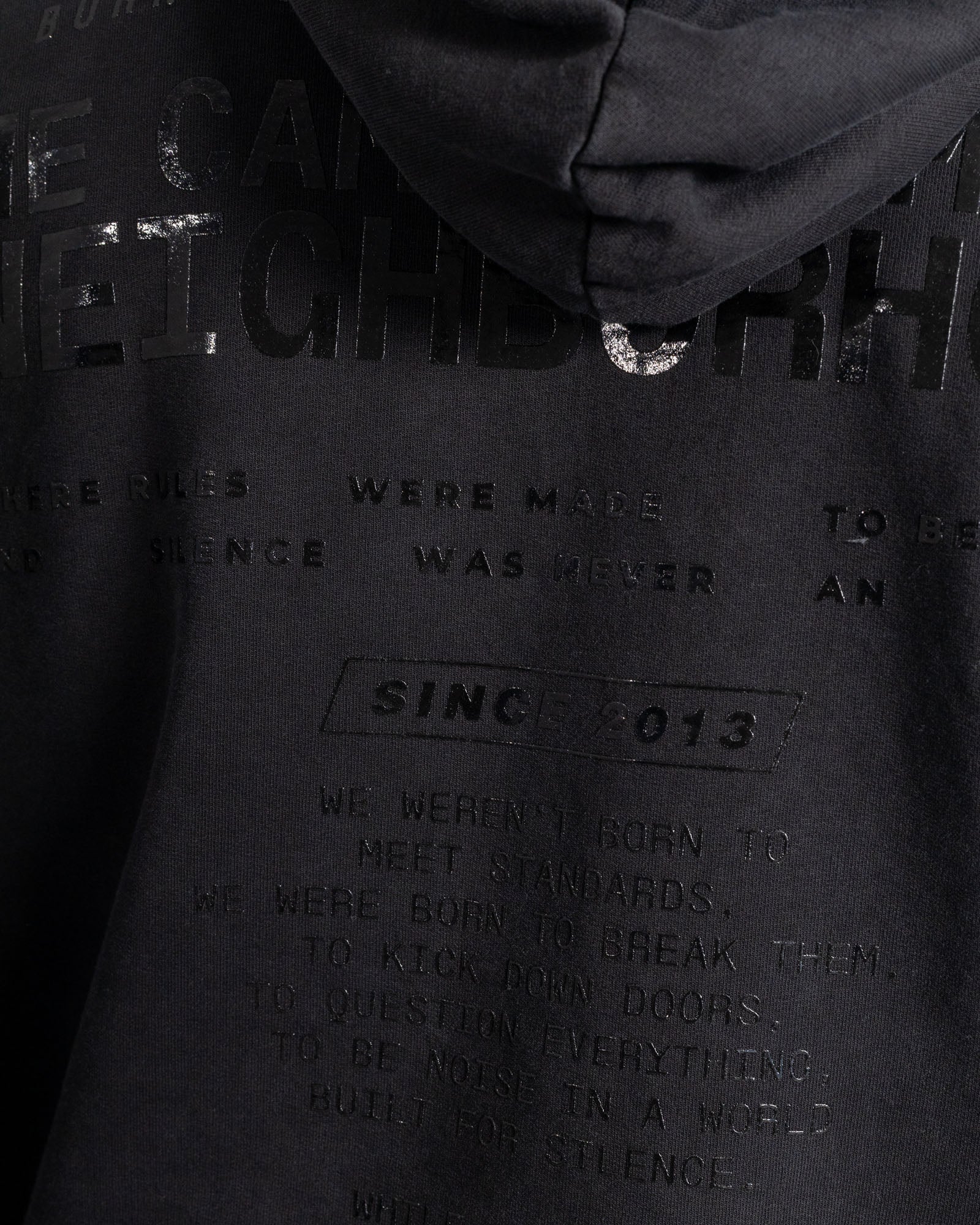 Hoodie oversize con estética street dark y acabado lavado, confeccionado en base textil gruesa para mayor estructura y comodidad. Incluye capucha amplia, bolsillo tipo canguro y detalles gráficos en relieve que elevan la prenda. Un fit suelto pensado para dominar la calle con actitud.