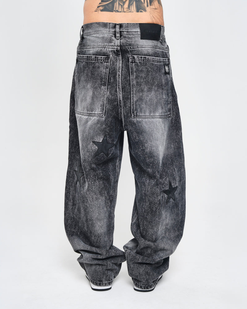 Jean baggy, redefine el streetwear con una silueta amplia de caída pesada y presencia dominante. Diseñado en denim premium resistente, combina textura desgastada tipo acid wash con aplicaciones de estrellas en relieve que elevan el carácter de la prenda.