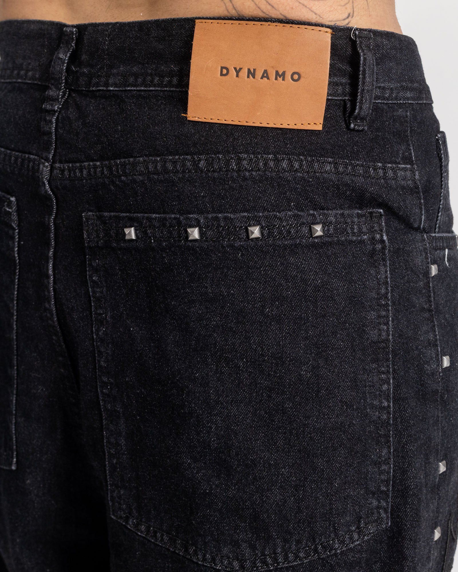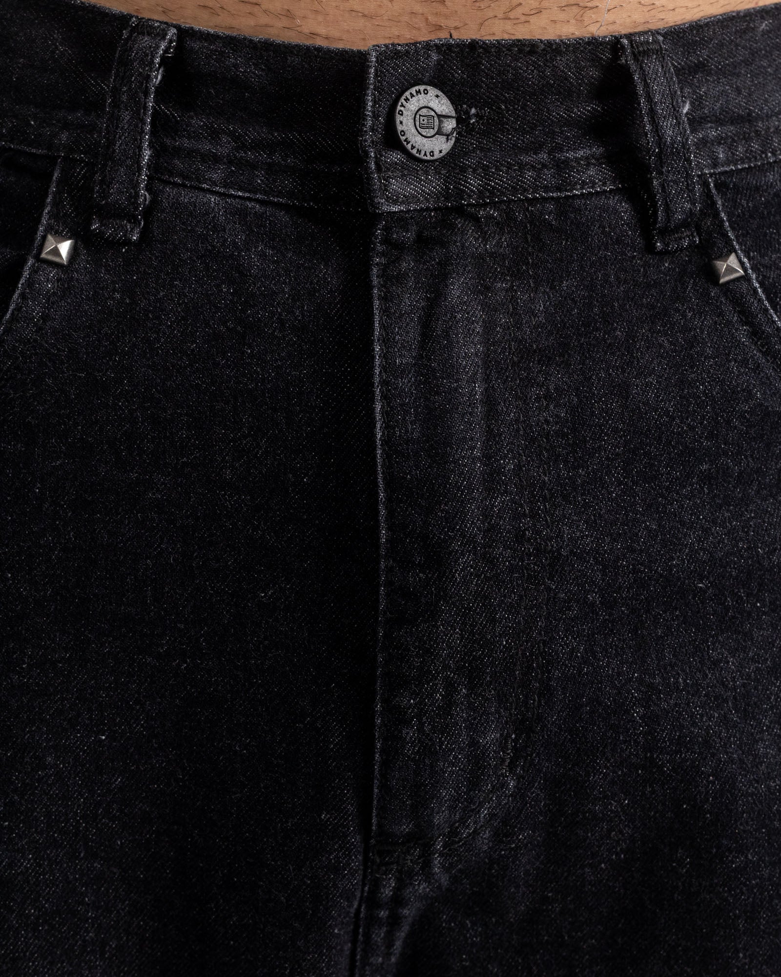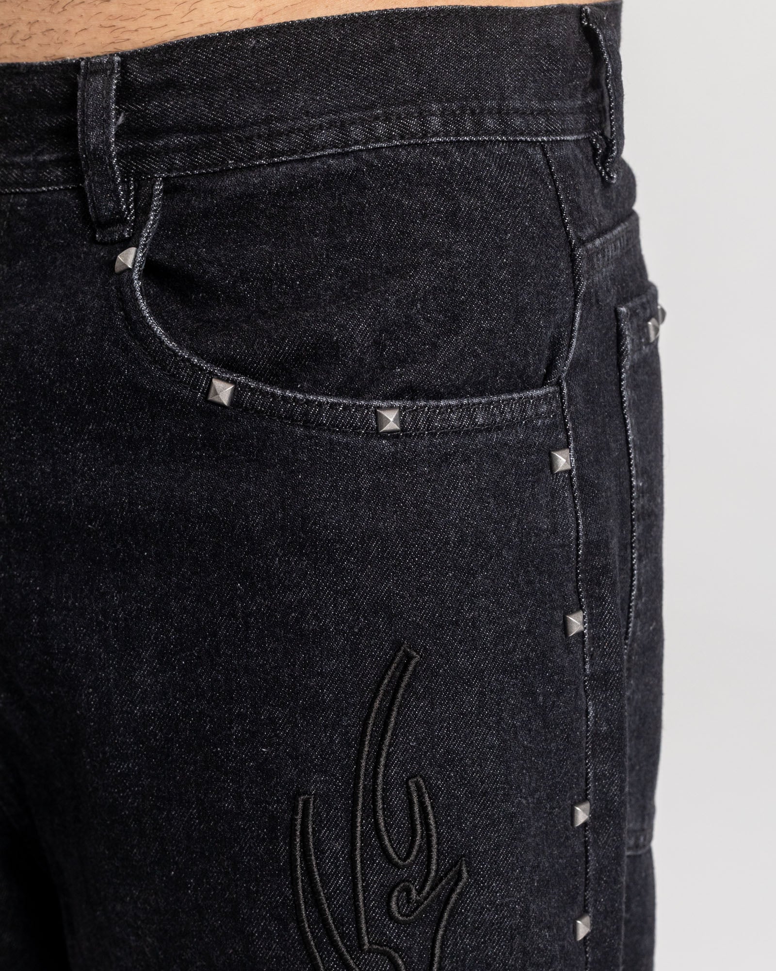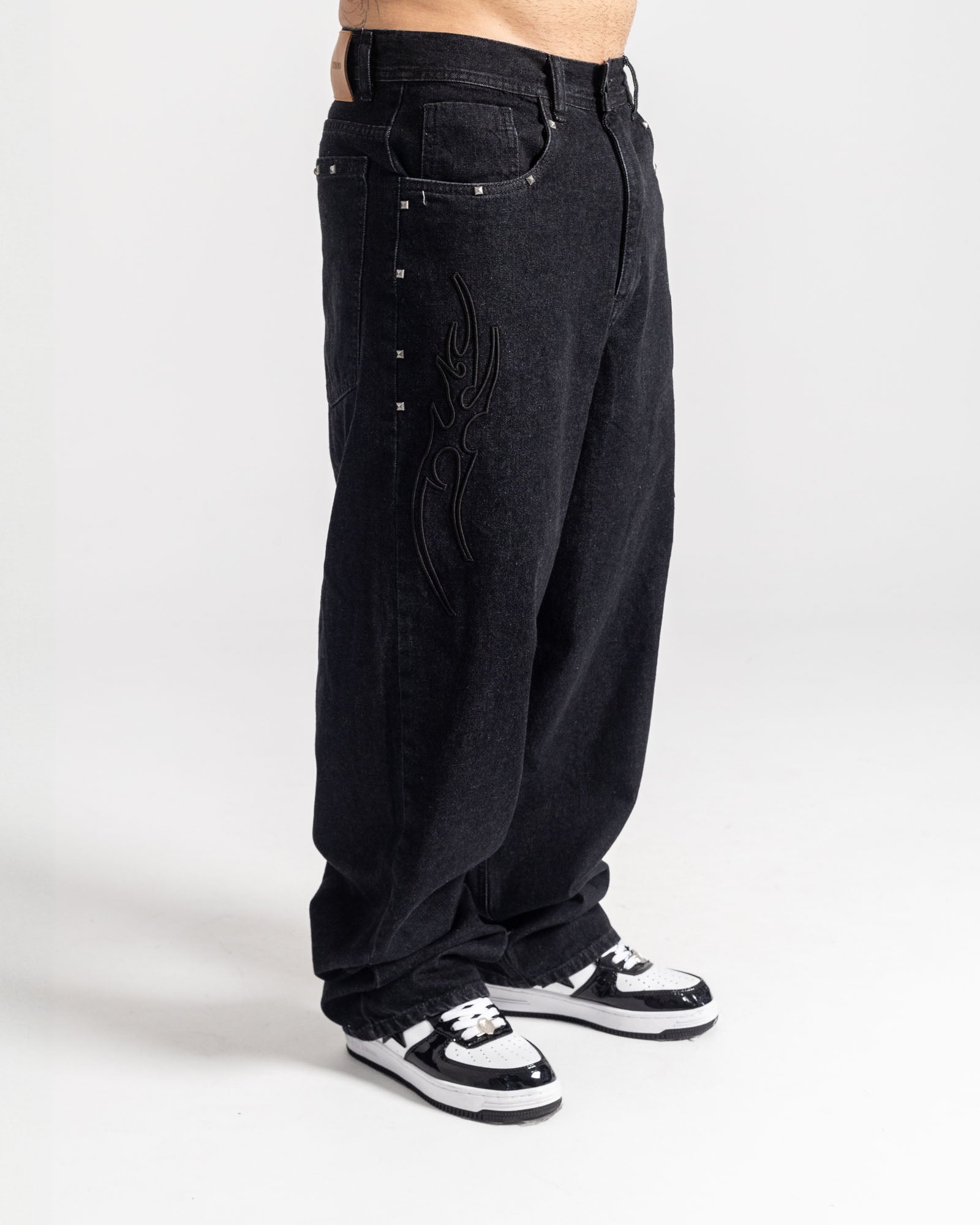 Jean baggy de fit amplio con ADN street. Confeccionado en denim resistente, incorpora bordado lateral tonal, taches metálicos en costuras y bolsillos, y un acabado lavado oscuro. Caída pesada, actitud firme y detalles que elevan el look.