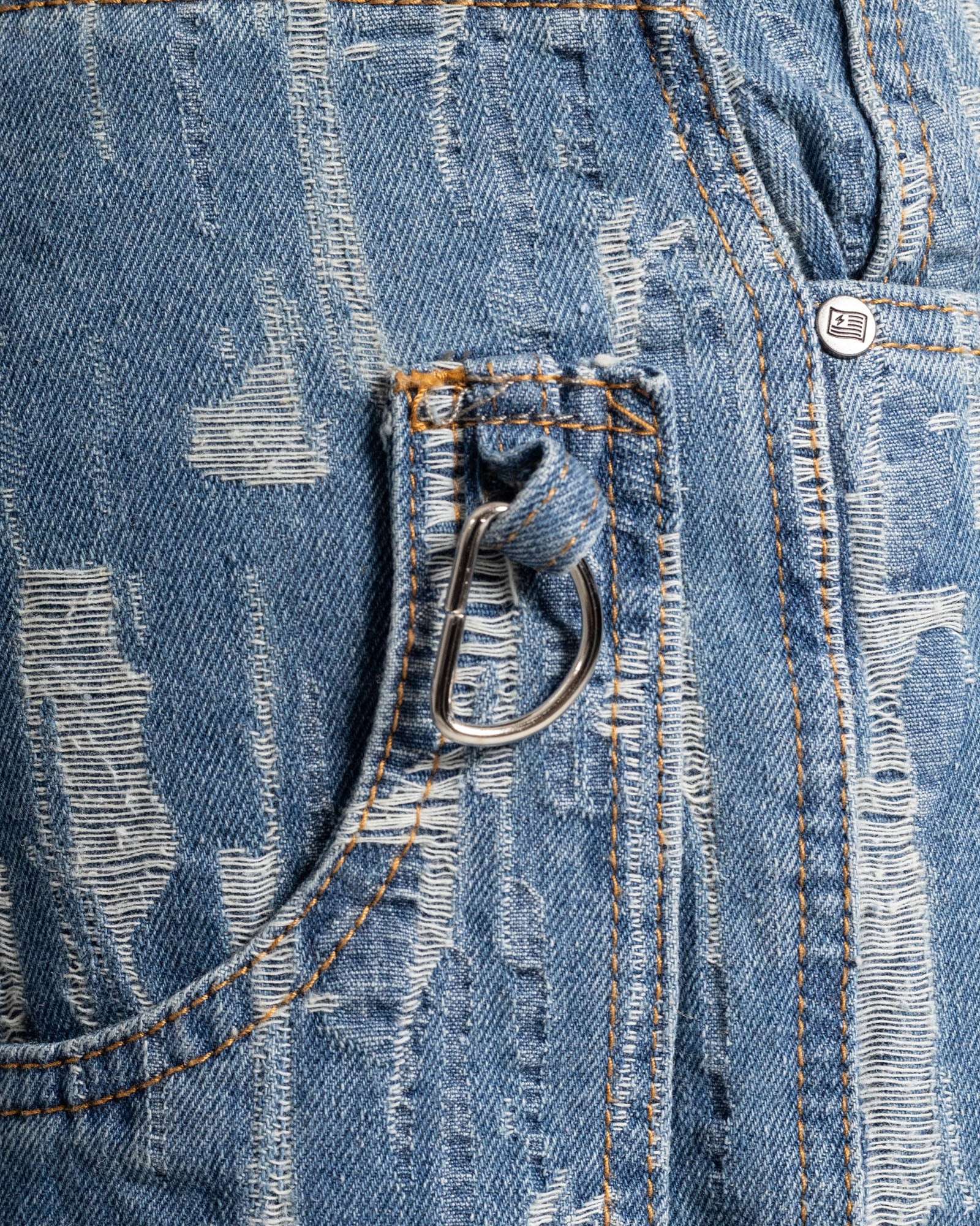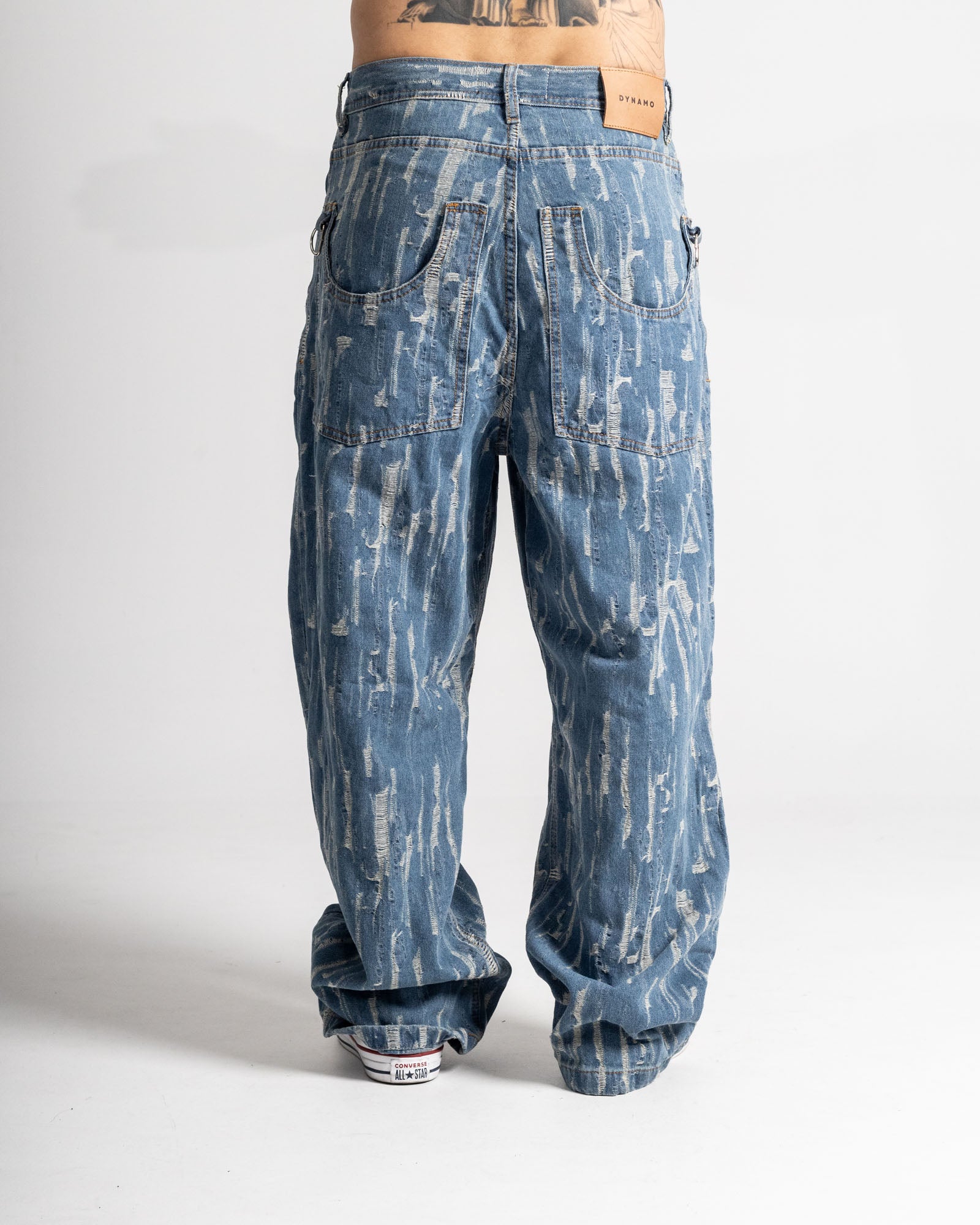 Jeans baggy de fit amplio y caída pesada, diseñado para romper la rutina. Con lavado azul medio y desgaste vertical tipo raspado que le da textura y carácter a la prenda. Bolsillos funcionales, costuras marcadas y estructura firme que mantiene el flow sin perder comodidad.