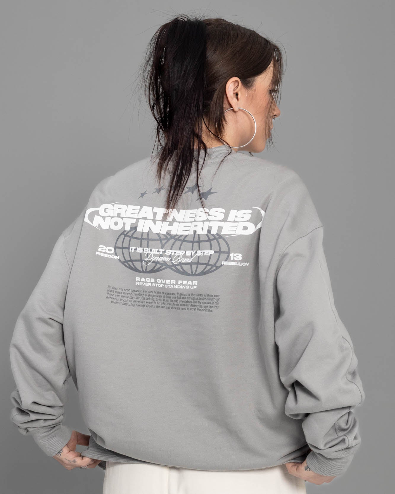 Jumper en 100% algodón, tacto suave y estructura estable para uso diario.Silueta oversize con mensaje tipográfico al frente: Greatness is not inherited — una declaración, no solo diseño.Hecho para quienes construyen su propio camino.
