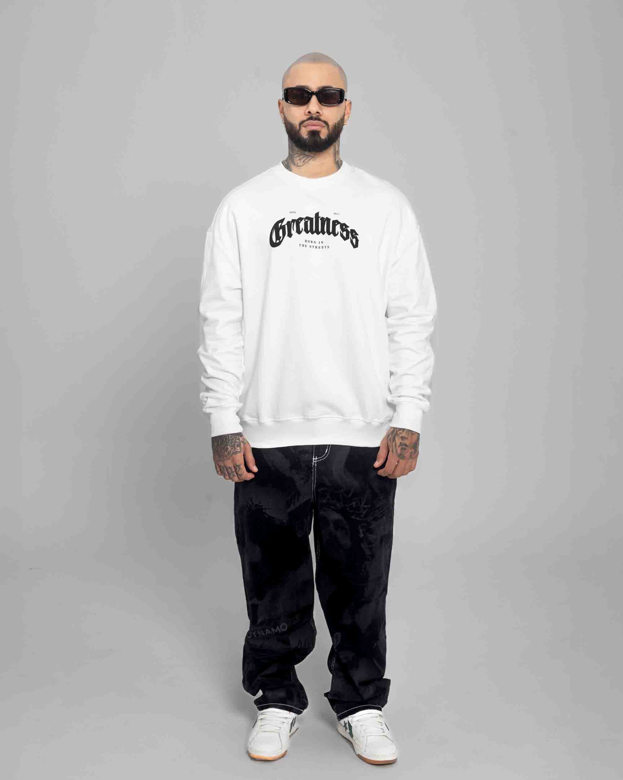 Jumper 100% algodón, tacto suave y fit oversize para caída relajada.Gráfico frontal y posterior inspirado en la cultura calle: Greatness is earned, not given.Hecho para quienes conquistan su lugar, no lo piden.