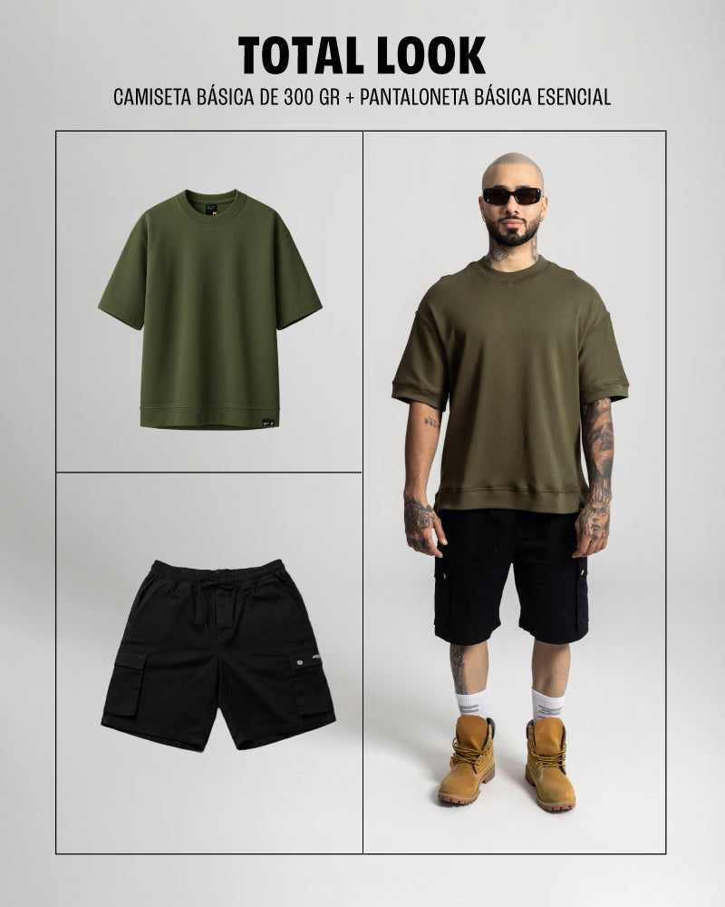Total look Básico y actitud street. Camiseta básica oversize 300 g con fit relajado combinada con bermuda cargo esencial de caída recta y tono neutro. Un outfit funcional, pesado y versátil, diseñado para el día a día sin perder carácter.
